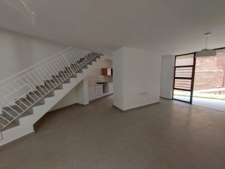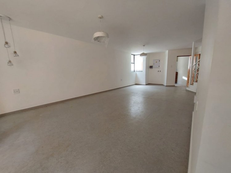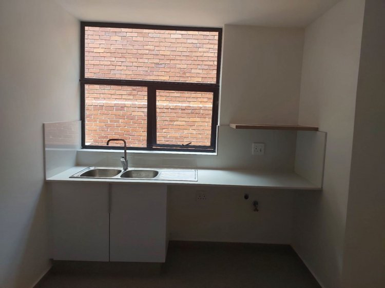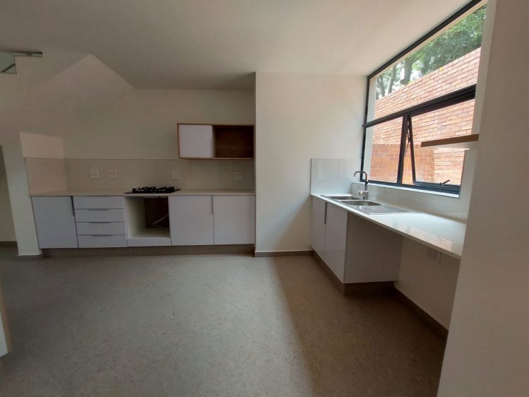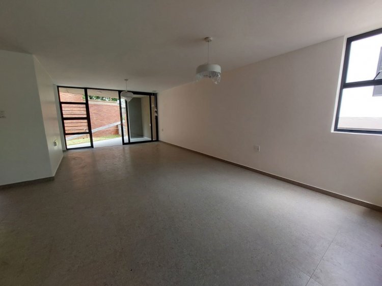 Open-plan living area, kitchen, and seamless access to the covered patio with built in braai oberlooking a small garden.