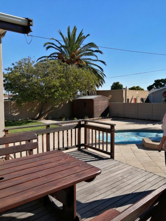 This area opens onto an expansive wooden deck, swimming pool and garden