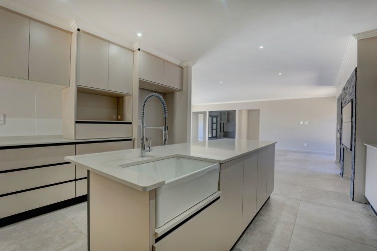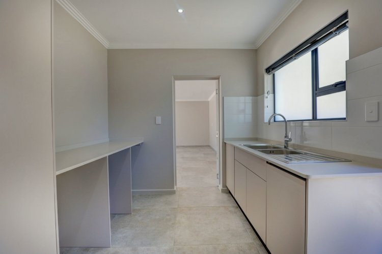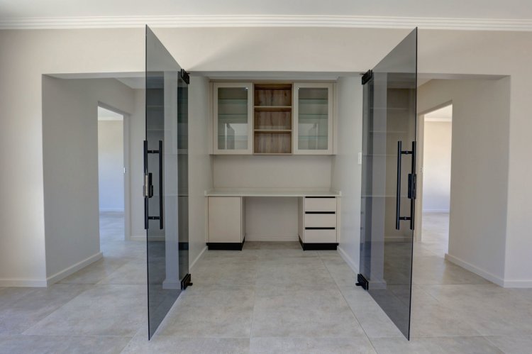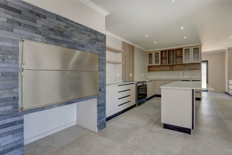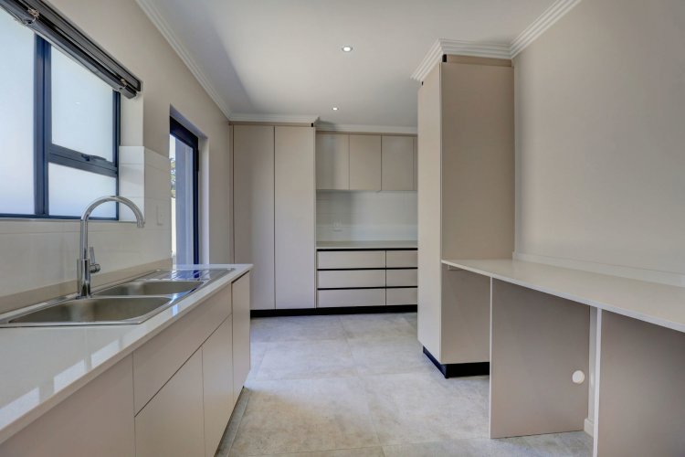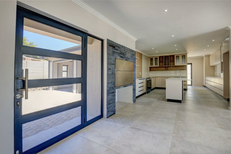 The kitchen forms a central feature of the home, and includes a large built-in braai, generous cupboard and drawer space, and Caesarstone countertops. A separate scullery opens to a sunny courtyard, providing practical utility space while keeping the main living areas uncluttered. An enclosed study or office is positioned for focused work or quiet use.