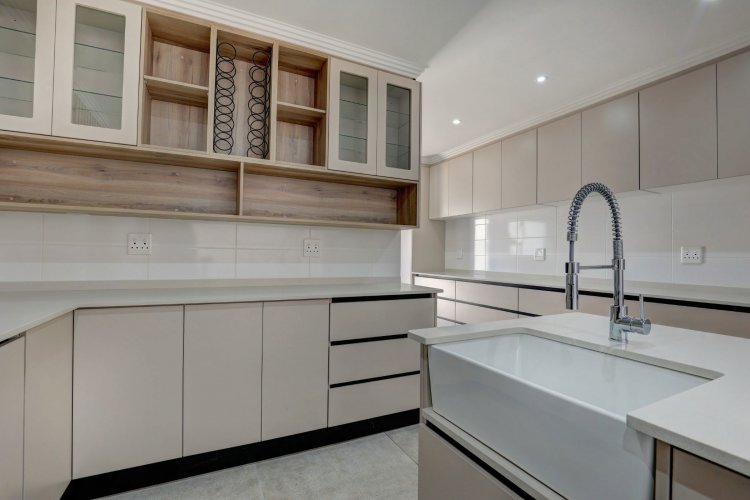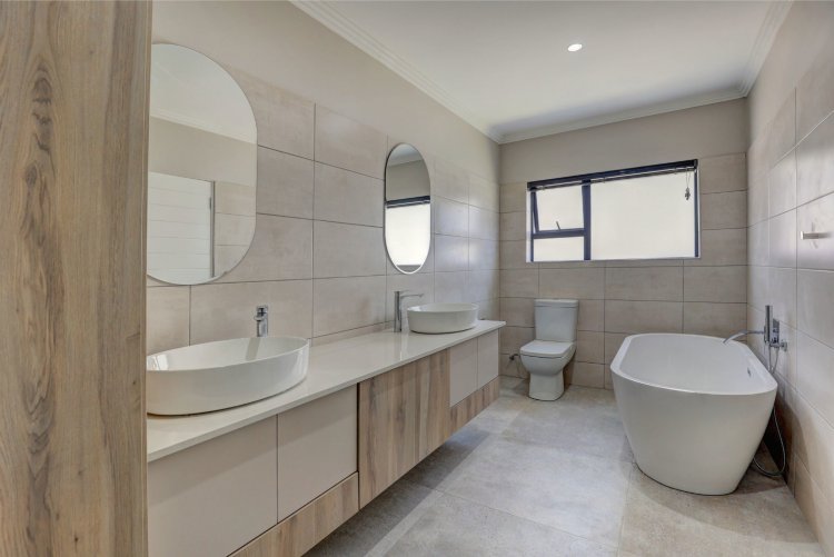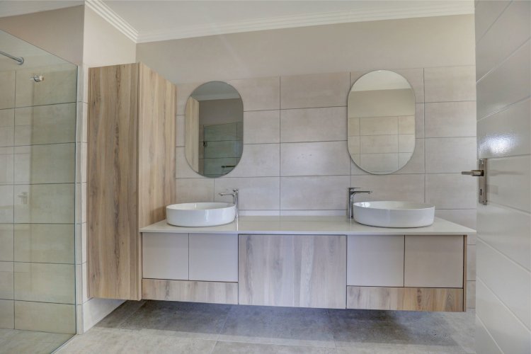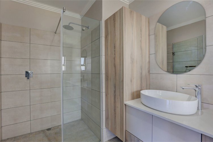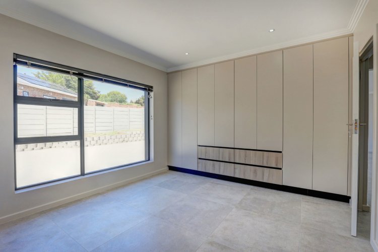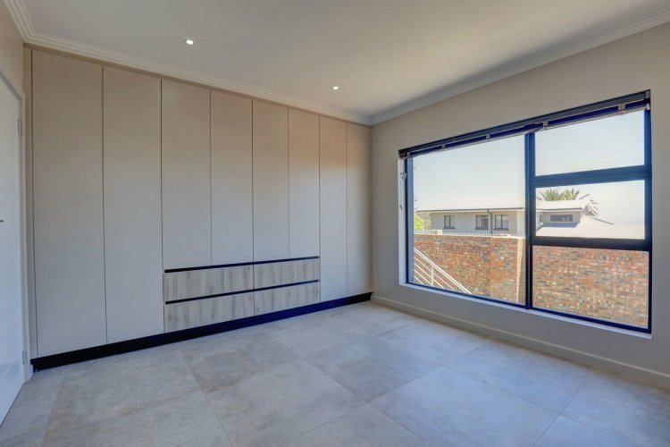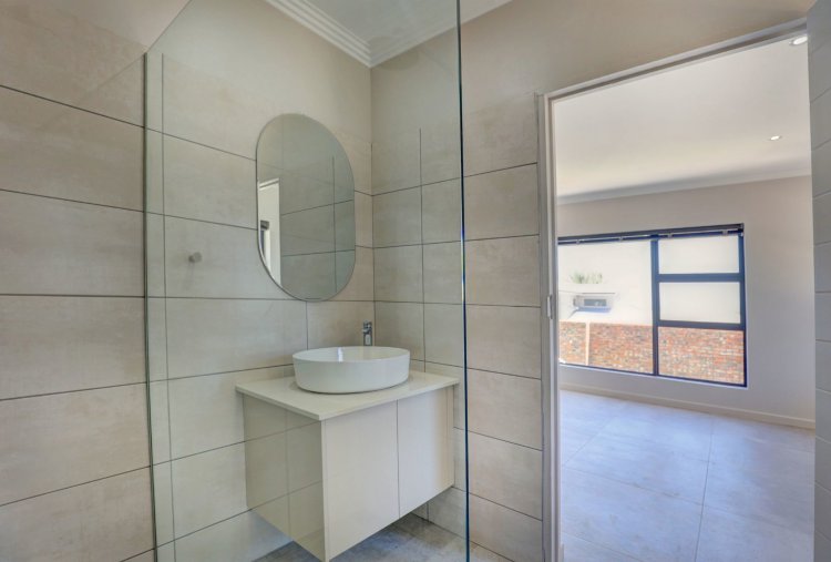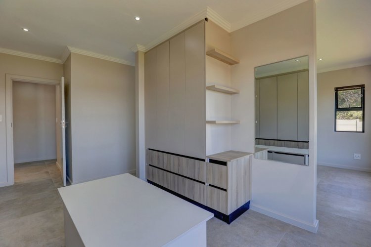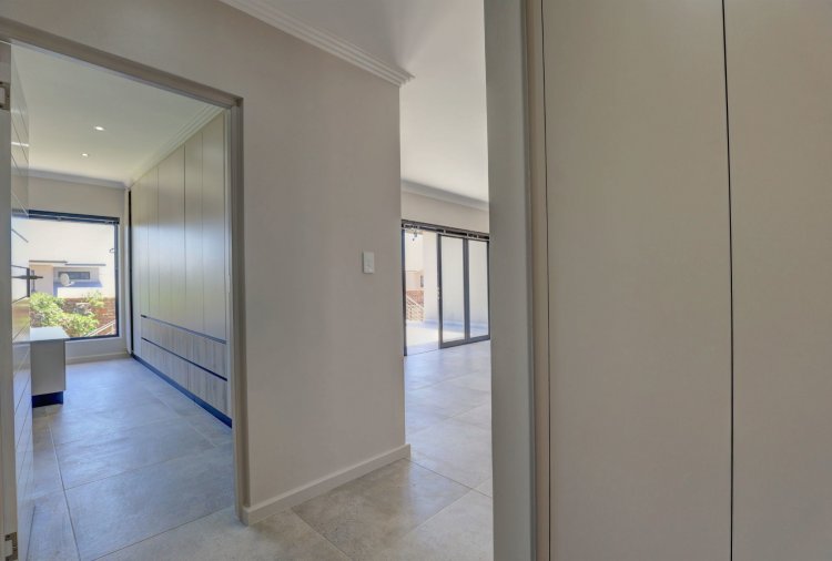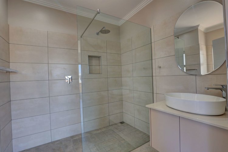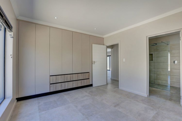 The spacious main bedroom features a full en suite bathroom and a walk-in wardrobe with extensive cupboard space. Bedrooms two and three are also en-suite, each offering large showers and ample built-in cupboards, ensuring privacy and comfort.