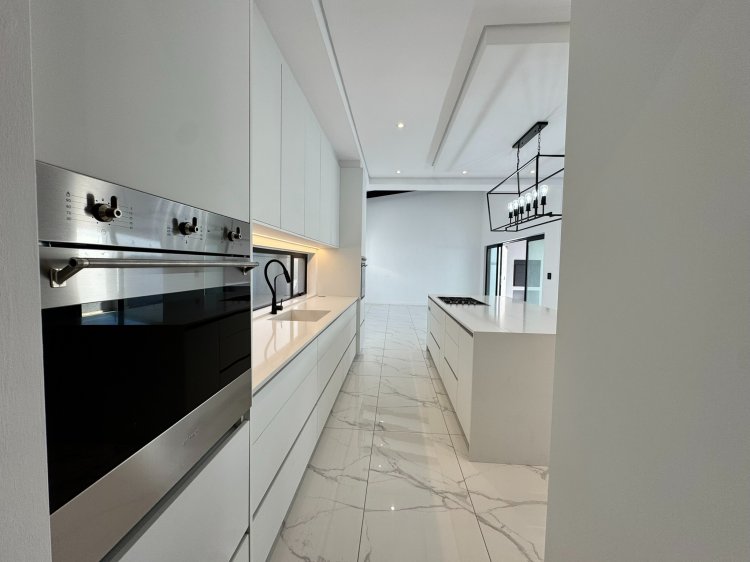 A long, refined entrance hall welcomes you into a bright and airy open-plan living space. The modern kitchen serves as the focal point, boasting sleek finishes, a central island with a gas hob, double ovens, and a spacious scullery with room for three appliances—ideal for both stylish entertaining and practical everyday use.