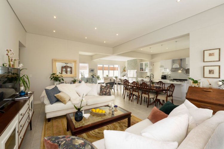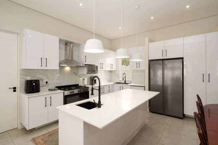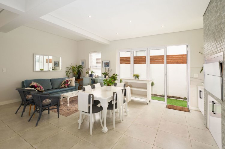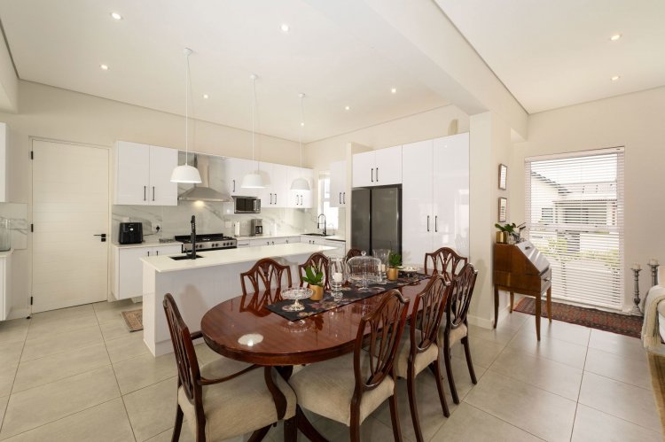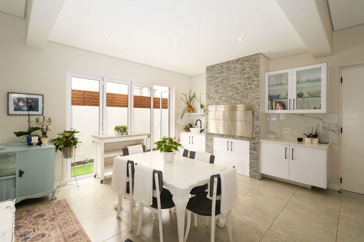 The open-plan living area is light and inviting, with seamless flow between the lounge, dining, and kitchen spaces. An indoor braai area adds to the home's entertainment appeal, making it perfect for year-round gatherings.