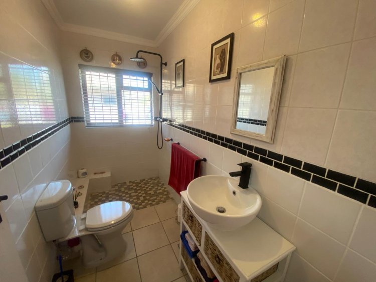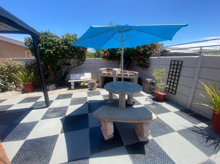 Fully fenced in, luscious garden (borehole water) and lovely outside relaxing space with braai, pool and shaded seating.