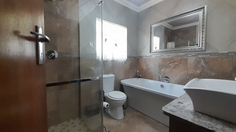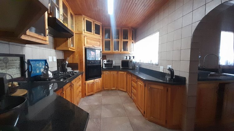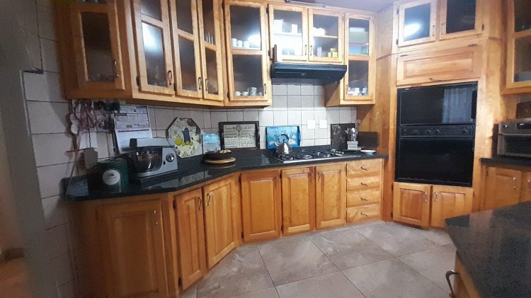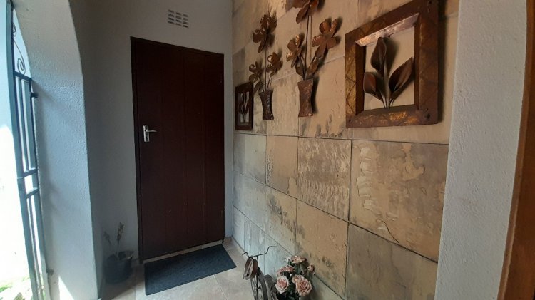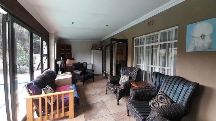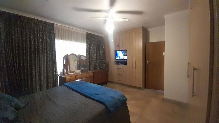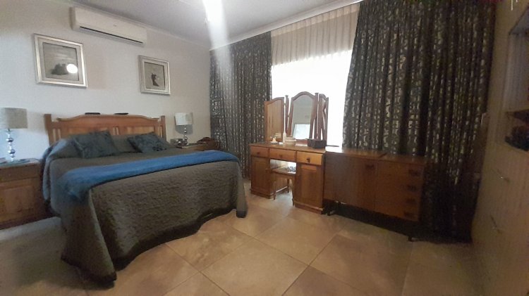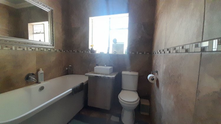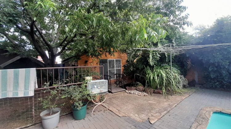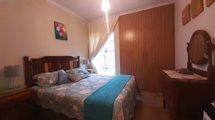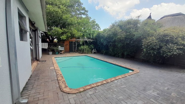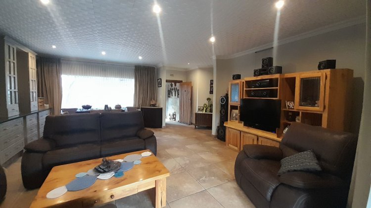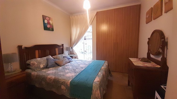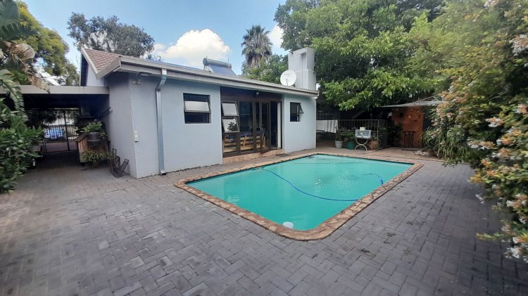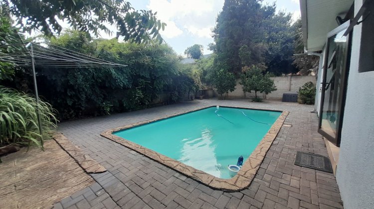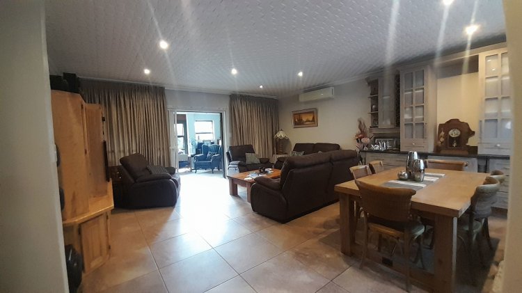 This beautiful, well-kept three-bedroom family home is situated in a quiet part of SE 6. You are immediately drawn to the immaculate, well-maintained garden. Upon entering, you are welcomed into a warm and spacious open-plan family/TV room and dining area with beautiful built-in cupboards. From the family room, stacker doors with a security gate lead to the entertainment room featuring an indoor braai. Sliding doors open onto a sparkling swimming pool, set privately within the garden—perfect for relaxed family living and entertaining. The stunning wooden kitchen is fitted with granite countertops, a gas stove, double eye-level oven, and extraction fan and a solar geyser. For added convenience is a scullery. The home offers three well-sized bedrooms. The main bedroom features two double built-in cupboards and an en-suite bathroom. Extras: Covered, enclosed carport and Double Garage Wendy house Alarm system Outdoor beams CCTV cameras Gas Geyser that can be converted back to electricity Borehole plus Jojo tank which is connected to the house, irrigation for front of property as well a filtration system for drinking water.