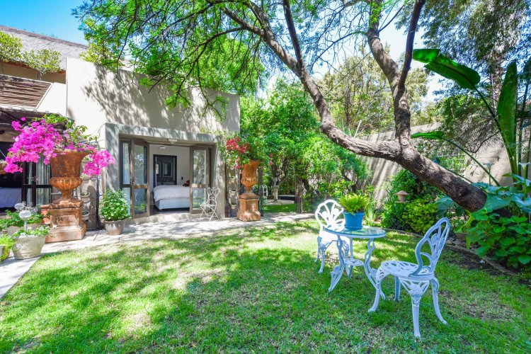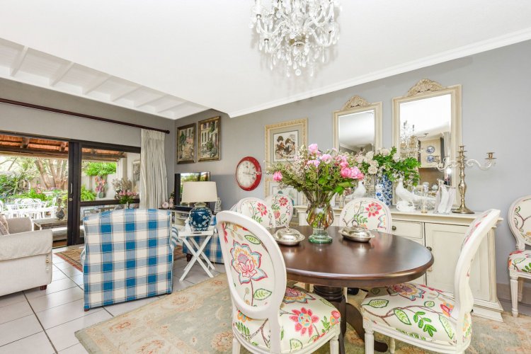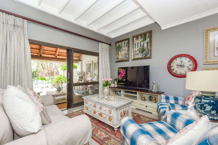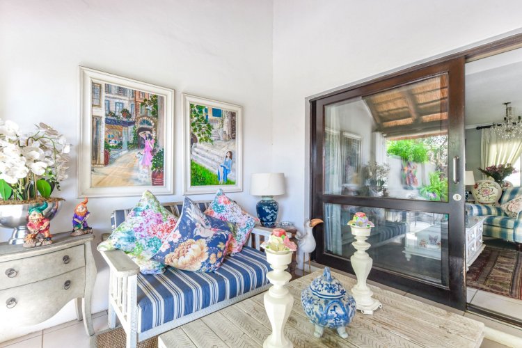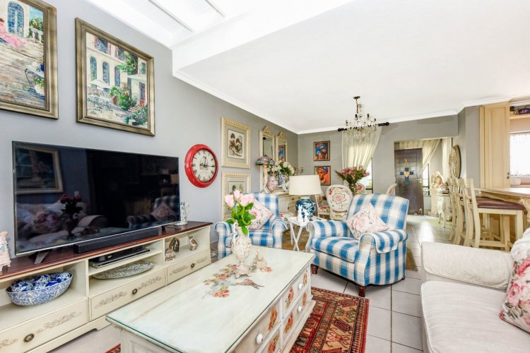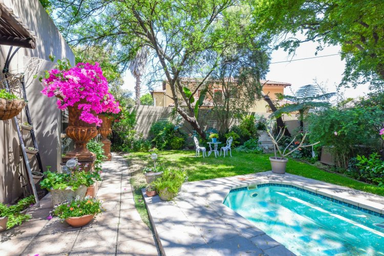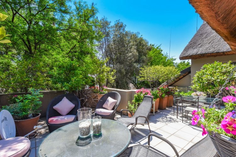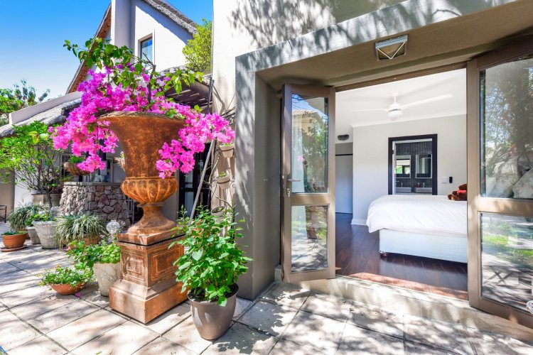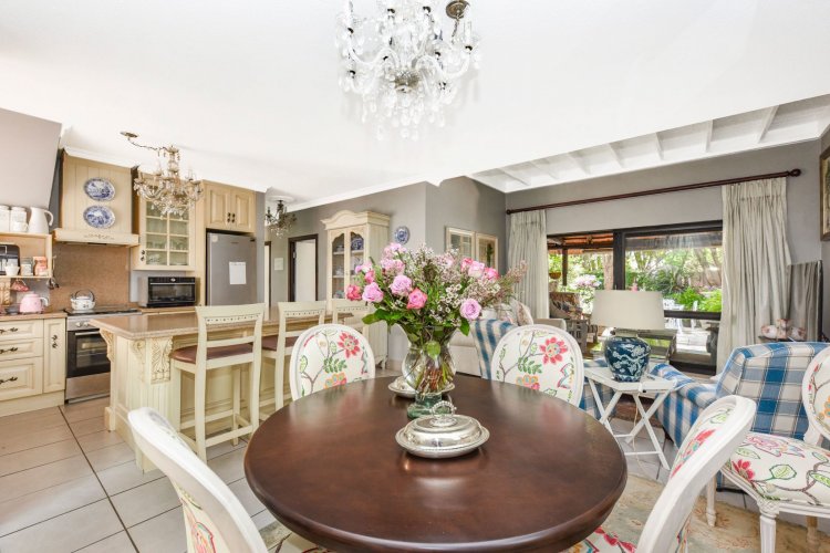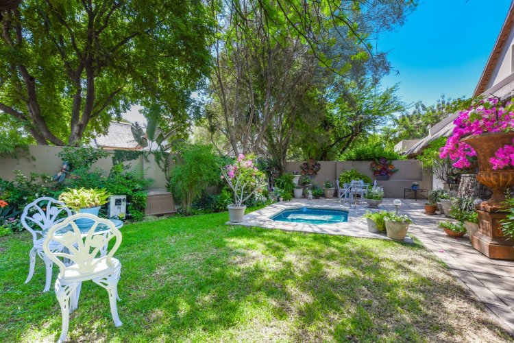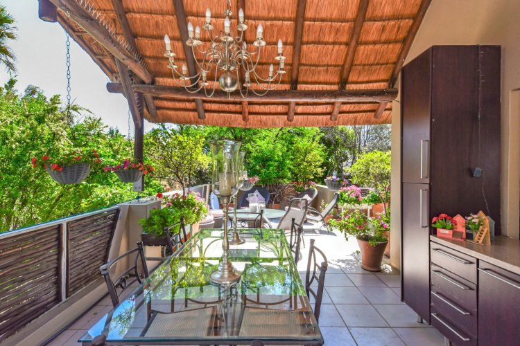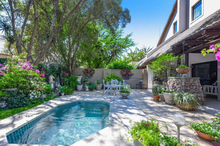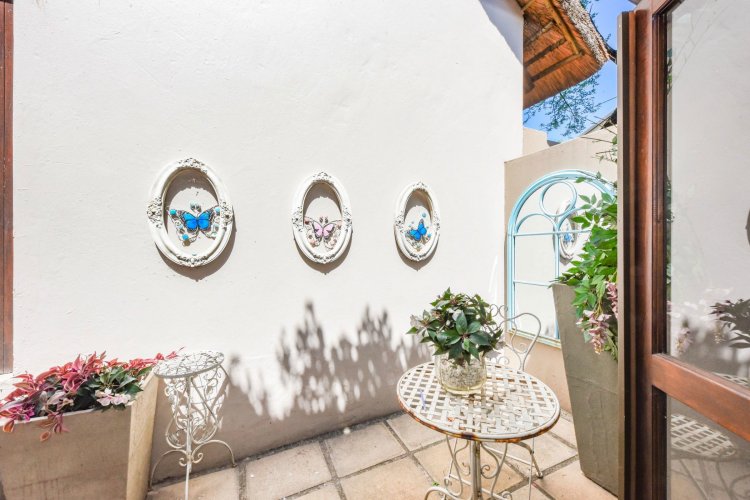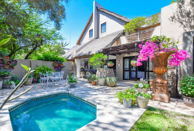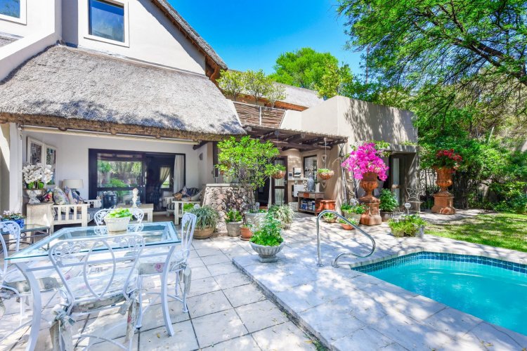 Welcome to a truly magical home — a rare gem that feels like it's been pulled straight from the pages of a storybook. Nestled in a beautifully maintained estate, this breathtaking 3-bedroom, 2-bathroom double-story townhouse offers the perfect blend of elegance, comfort, and charm. As you step through the front door, you are instantly drawn into a space that exudes warmth and style. To your left, a stunning open-plan kitchen awaits, featuring a generous center island, ample counter and cupboard space, and a layout ideal for both family meals and entertaining guests. On your right, the open-plan dining area flows seamlessly into the spacious living room, with sliding doors opening onto a covered patio. This outdoor oasis overlooks a one-of-a-kind private garden, bursting with vibrant flowers and shaded by mature trees — all centered around a crystal-clear swimming pool. Whether it's a summer afternoon with the family or a relaxed evening with friends, this space is made for unforgettable memories. Back inside, all three bedrooms open directly onto the garden through charming French doors, inviting natural light and greenery into every room. The main bedroom boasts a luxurious en-suite bathroom, completing a well-thought-out and functional layout. Upstairs, you'll find a large, versatile space — perfect for a home office, creative studio, or entertainment area — which leads out onto a private upper patio, once again surrounded by fragrant blooms and treetop views. Located close to major shops, top-rated schools, and key amenities, this home offers both convenience and tranquility in equal measure.