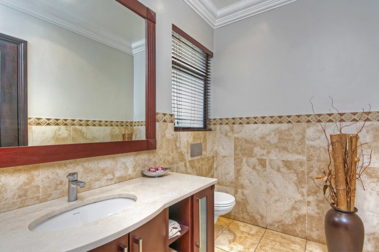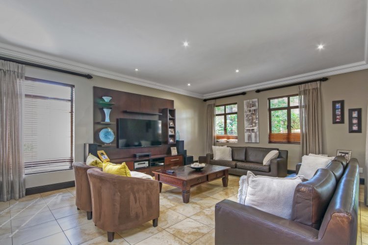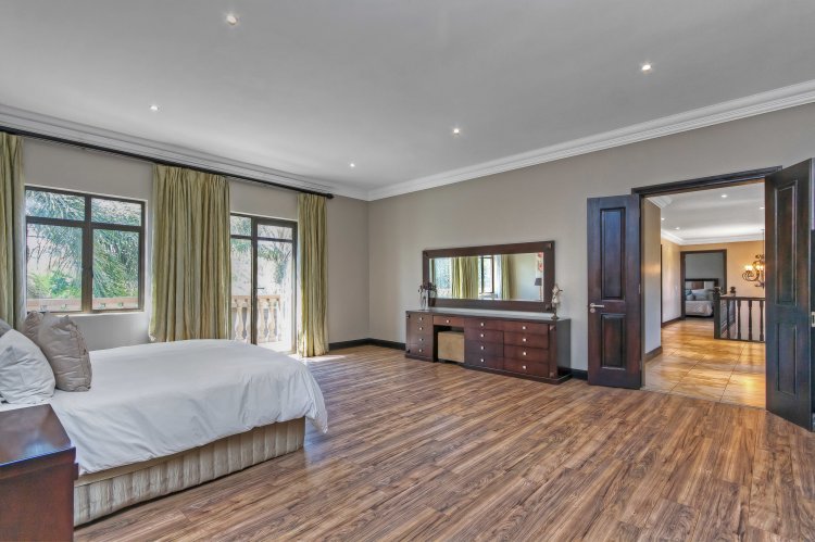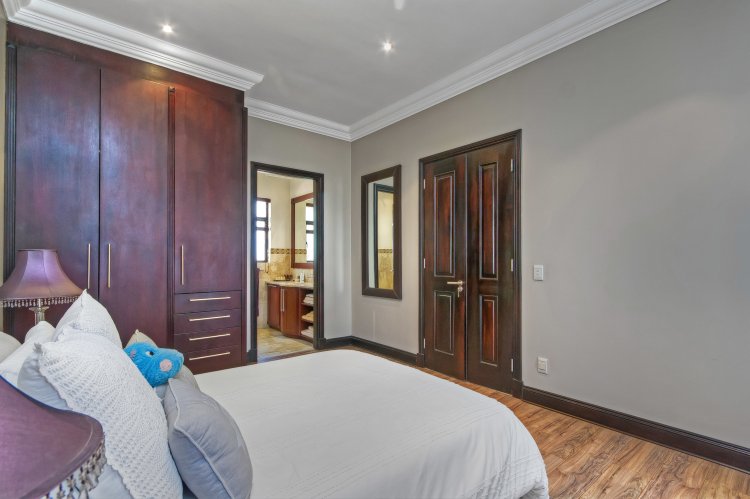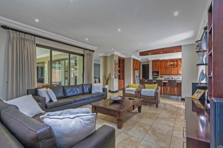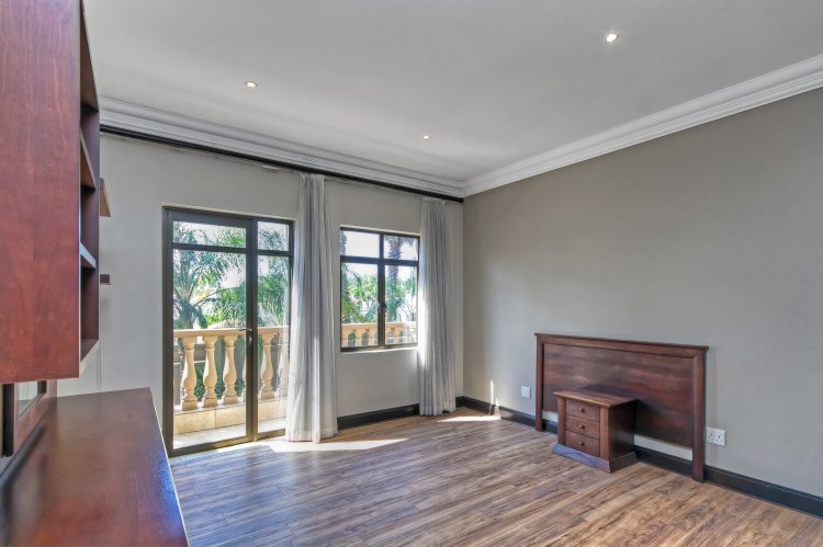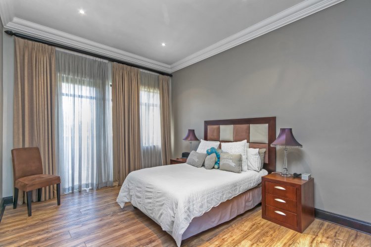 Step into luxury with this exquisite 4-bedroom family home nestled in the prestigious Khyber Fountains Estate. Designed for both comfort and elegance, this residence offers generous living spaces, high-end finishes, and impeccable attention to detail. Property Highlights: • 4 Spacious En-Suite Bedrooms All upstairs bedrooms feature vinyl flooring, private access to the patio, and modern bathrooms. The master suite is a private sanctuary with a walk-in dressing room, a luxurious en-suite with a double shower, and direct patio access. • Multiple Living Areas Grand entrance hall, formal lounge with wood-burning fireplace, open-plan TV room, and a massive pajama lounge upstairs. • Entertainer’s Dream The dining room includes a built-in bar and wine cellar, while stacking doors lead from the lounge to a covered patio overlooking a pristine garden and sparkling pool with water feature. • Gourmet Kitchen Chef’s kitchen with ample storage, premium appliances, and a separate scullery with direct access to the drying yard. • Private Study with built-in cupboards • Guest Bathroom & Storeroom Additional Features: • Exceptional Staff Quarters / Flatlet: 2 bedrooms, 1 bathroom, and a kitchen – ideal for staff or extended family. • Full Backup Power: Estate-wide generator system ensures no interruption during load shedding. • Secure & Sought-After Complex with excellent management and community.