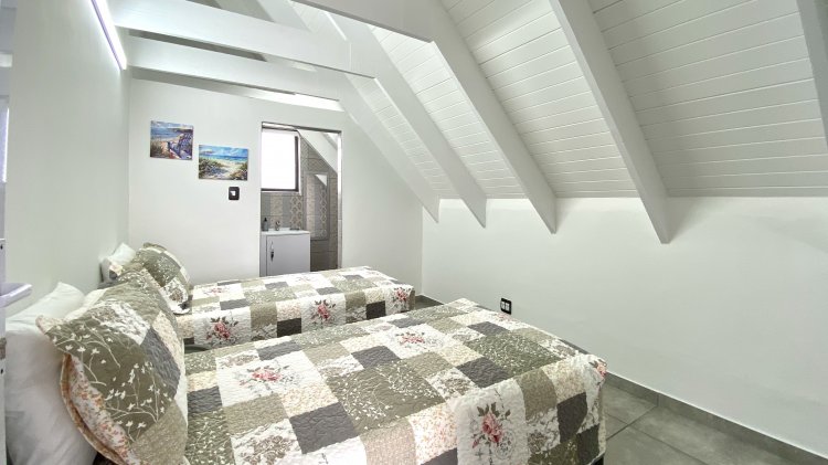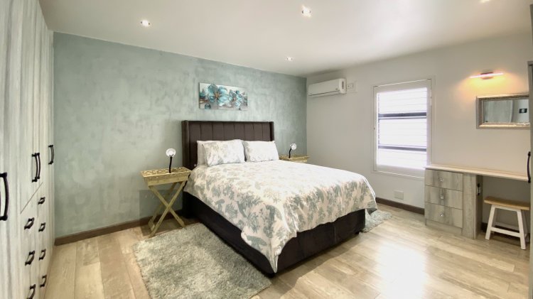 Ideal for guests or rental income, the self-contained flat includes an open-plan layout, a kitchen with an indoor braai, and a private outdoor entertainment area. Upstairs, two en-suite bedrooms share a balcony with views of lush greenery and the ocean.