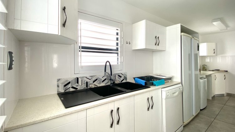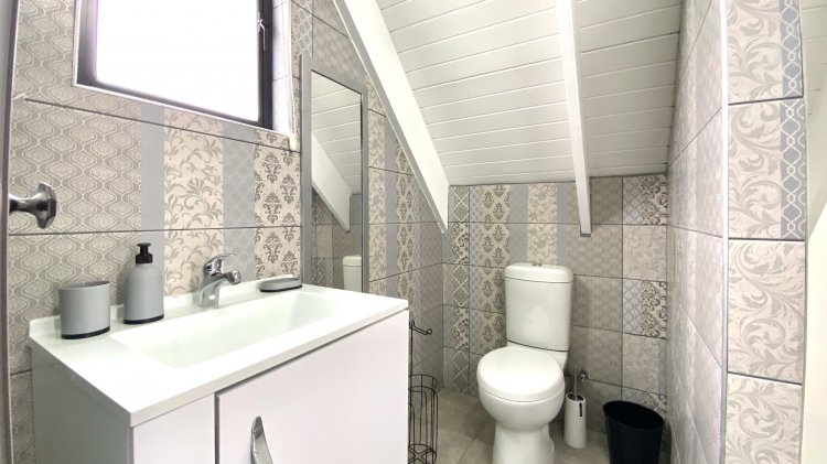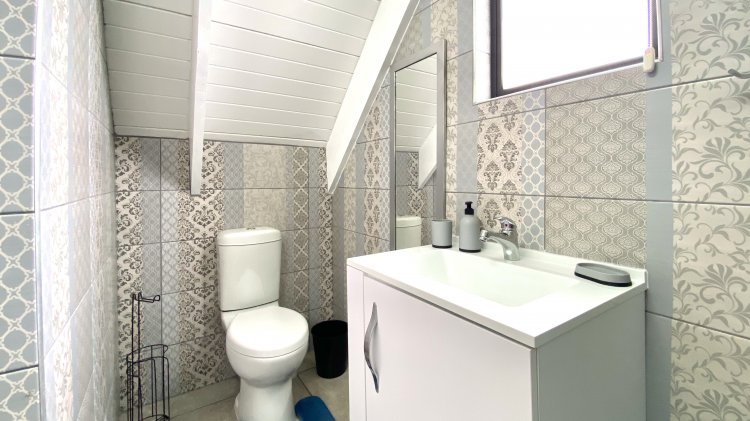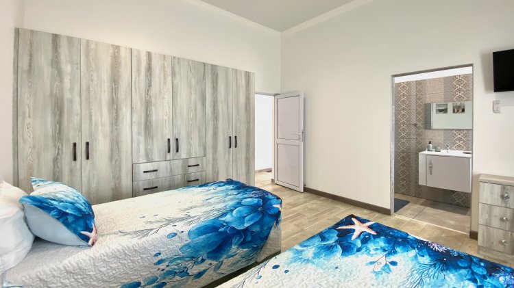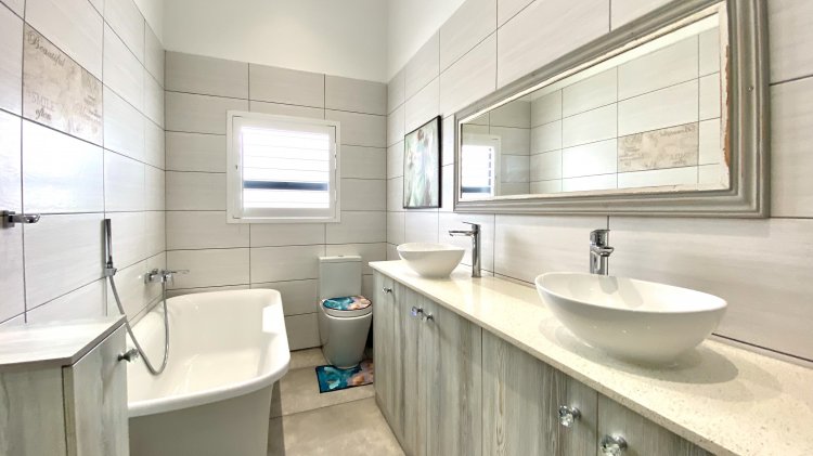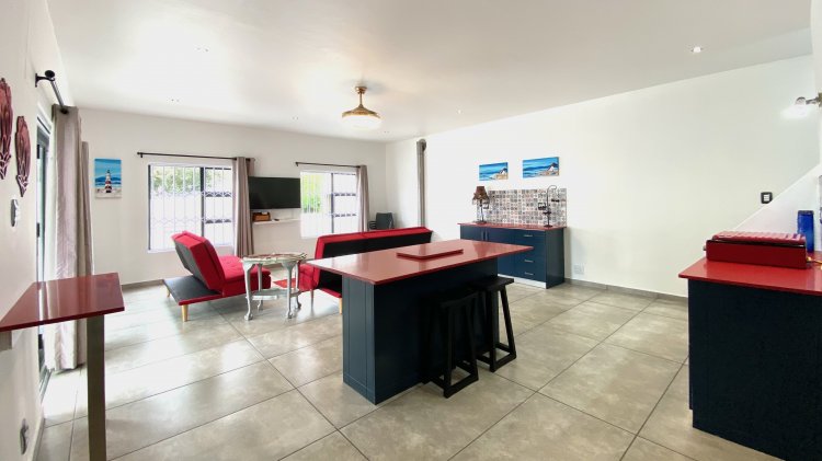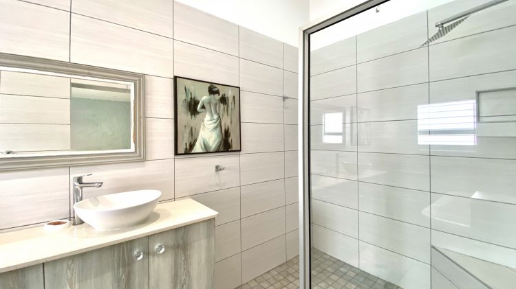 The main residence offers open-plan luxury with a spacious lounge, dining area, and modern kitchen with a generous scullery/laundry, perfect for entertaining with an indoor braai. It includes two en-suite bedrooms with ample storage, with the master bathroom featuring a bath, shower, and dual sinks.
