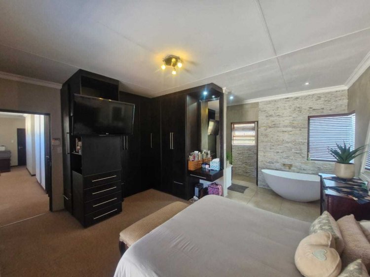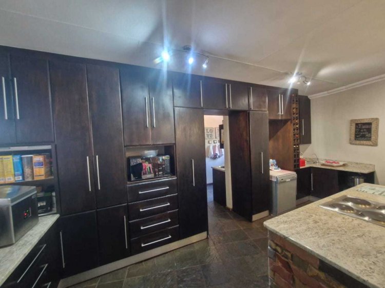 Property Features: Freestanding, fully walled property with electric fencing for added security 8 kVA solar system with 4 x 5.12 kWh batteries and 22 panels – enjoy energy independence JoJo tanks with pressure pumps, water softener, and full automatic irrigation system Alarm system, camera system with 4 cameras, and electric main gate Air conditioners throughout the home Open-plan kitchen and living area with a spacious dining area and indoor fireplace Scullery, built-in cupboards, and indoor storage room 4 large bedrooms with built-in wardrobes and a linen cupboard Dedicated study room – perfect for remote work or a home office Double electric garage plus 4 covered carports at the back Three entrances (two front, one back) and a special feature front door Lush green garden with shade trees and full irrigation system Cold and warm swimming pool for year-round enjoyment Covered patio with built-in braai – ideal for entertaining