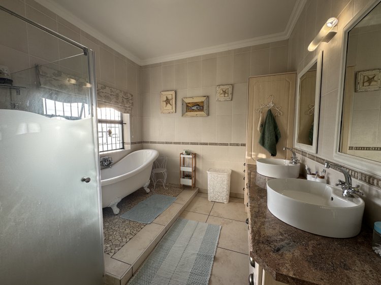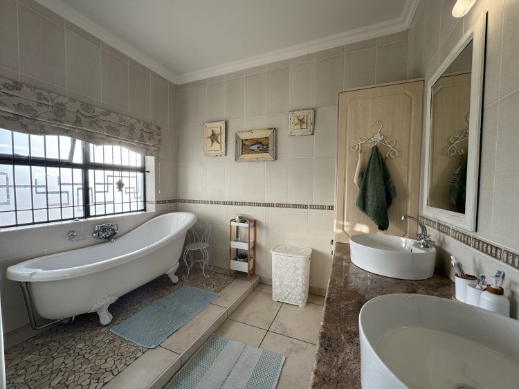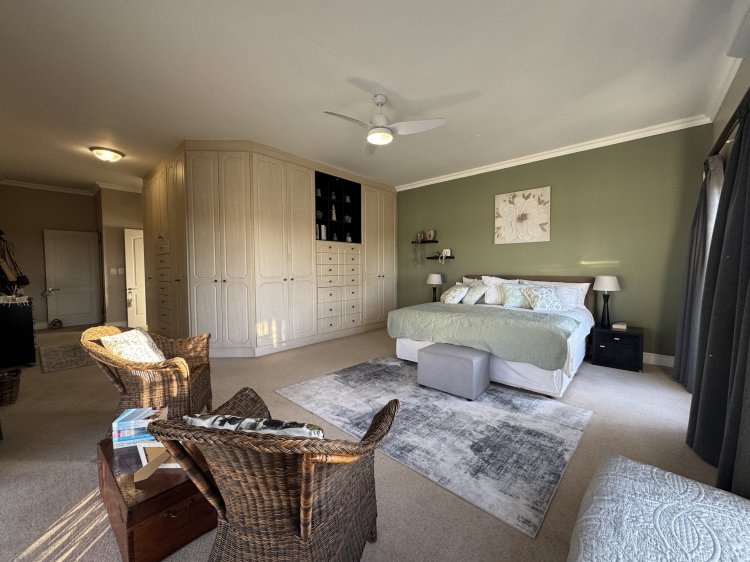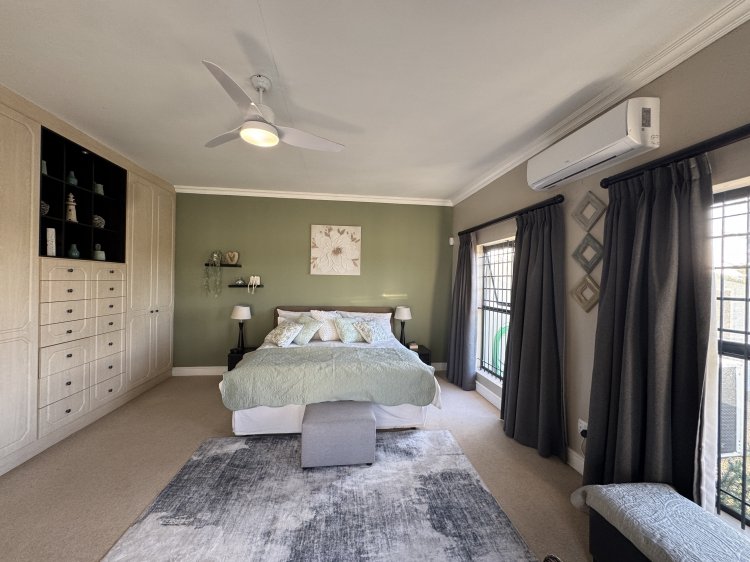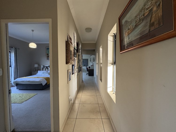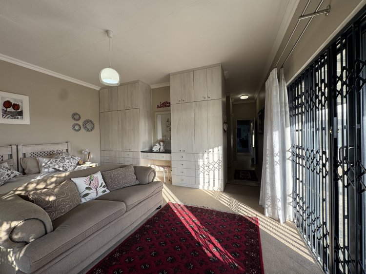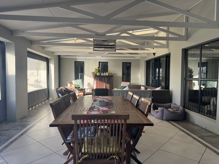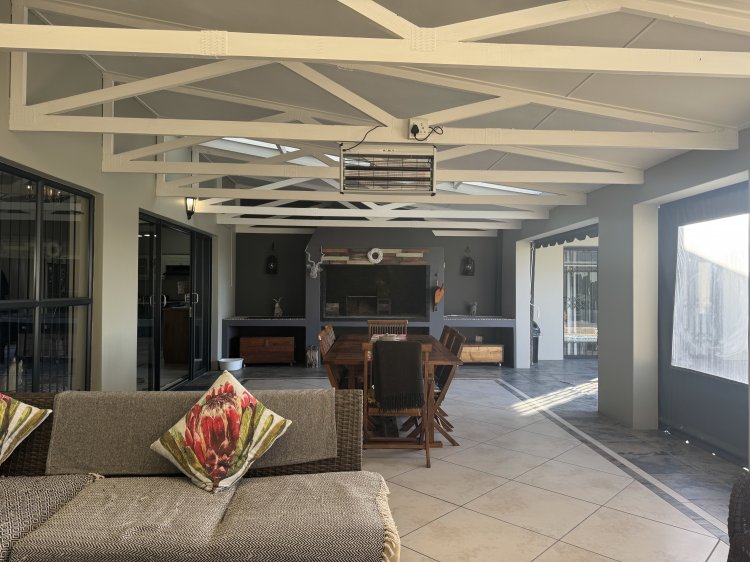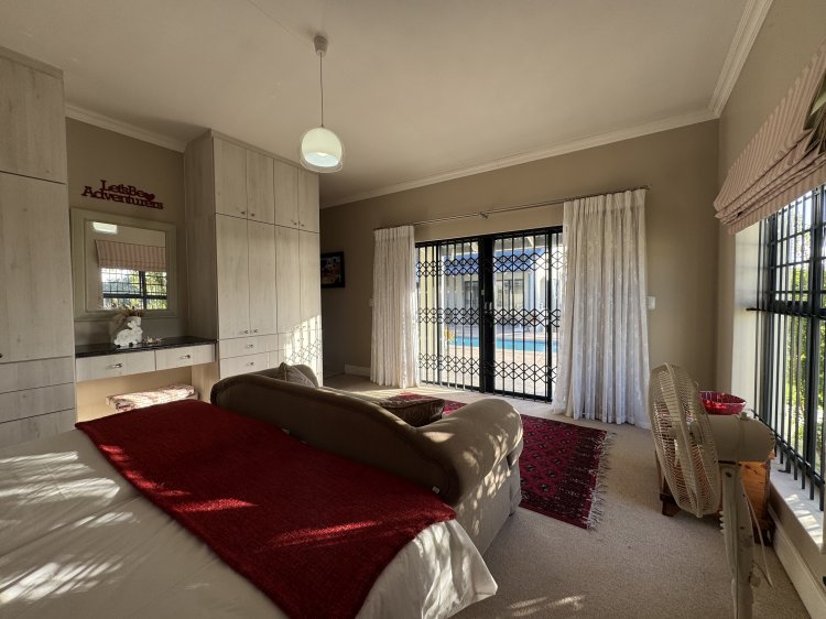 Choose from two generous main suites, both featuring en-suite bathrooms and direct access to the pool through sliding doors—perfect for enjoying sunny days and peaceful evenings. A third bedroom is ideal for guests, serviced by a full family bathroom. The north-facing entertainment patio, sheltered from prevailing winds, is a sun-soaked retreat complete with a sparkling pool and built-in braai—ideal for relaxed weekends and social gatherings.