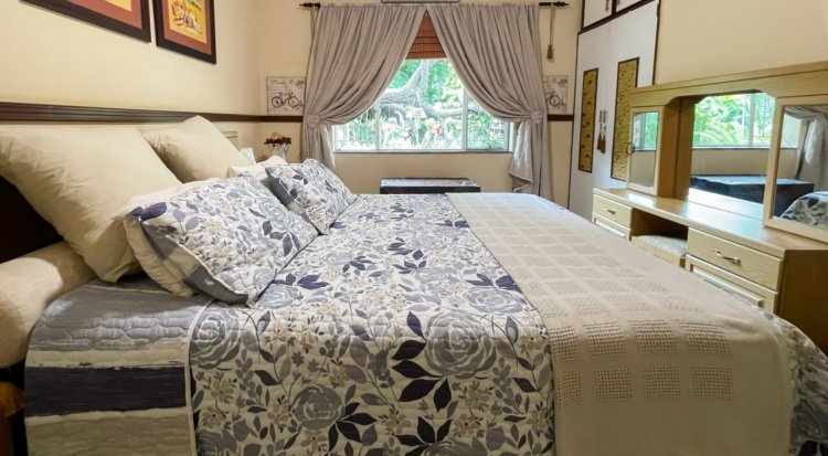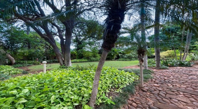 The property is fully walled, offering privacy and security, with manicured gardens and plenty of space for outdoor living.