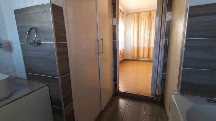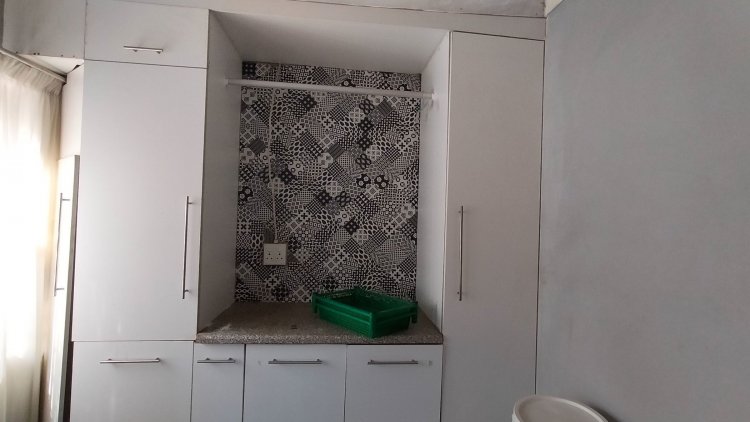 The kitchen is well-designed with ample cupboard space and includes a separate adjoining laundry area.