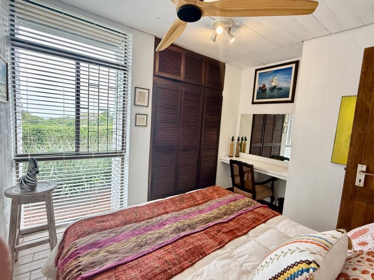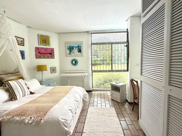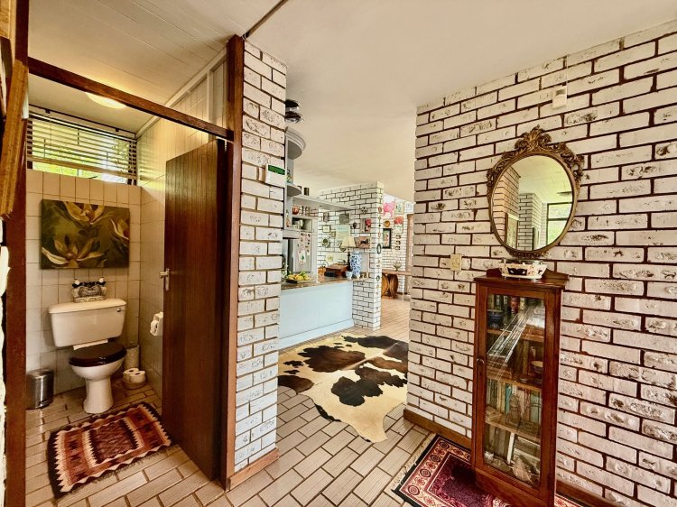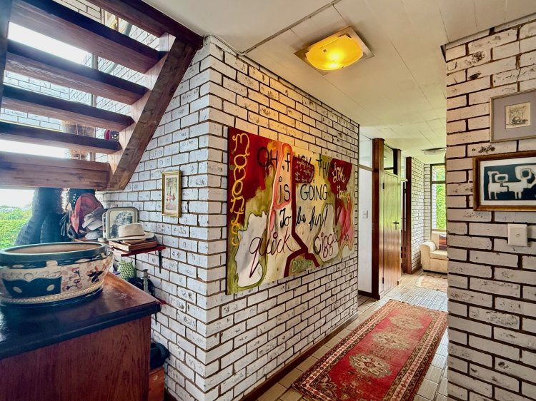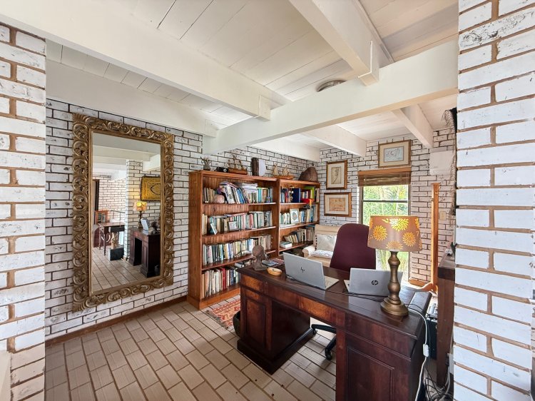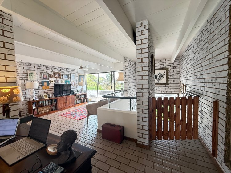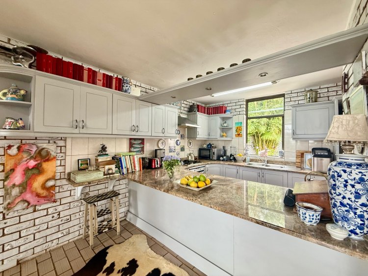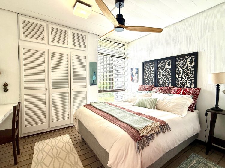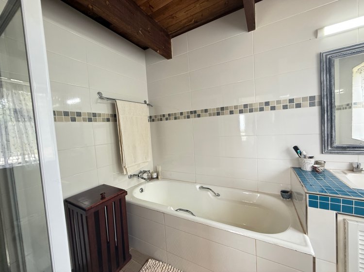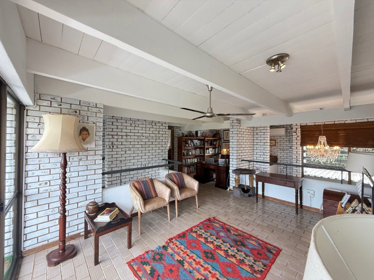 This double-storey family home offers four bedrooms and two bathrooms, including a master suite with a full en-suite. The ground floor features an open-plan kitchen with seamless flow to the dining and living areas, opening out to a covered patio and swimming pool. Also on this level are three bedrooms, a shared bathroom, a linen cupboard, and direct outdoor access. The upper level comprises a study, a pyjama lounge, and the spacious master bedroom with en-suite bathroom. Comfort is ensured with air-conditioning units and ceiling fans throughout the home. Additional features include a double, extra-length garage, staff accommodation and a storage room located in the same outbuilding. The property is situated on a large stand with a borehole, a 5,000-litre water tank, filtration system, and pump feeding the house, as well as an electronic irrigation system. Sustainable living is supported by a solar installation with 12 maxi panels and a 10kVA inverter system and a new alarm system. The garden includes a variety of fruit trees and a raised vegetable garden, enhancing the lifestyle appeal of this home.