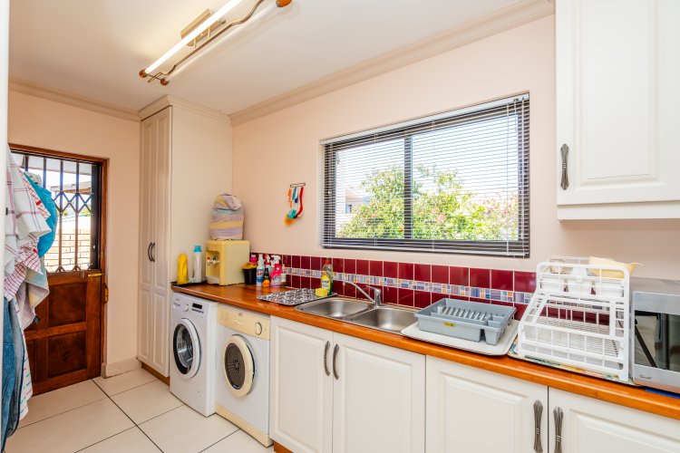 • Open-plan lounge, dining, kitchen & braai room with excellent flow • Air-conditioner cools the entire main living area • Enclosed braai room with stacking doors opening to a covered patio and manicured garden • Spectacular lagoon views from all entertainment spaces • Chef’s kitchen with solid cherrywood tops & cabinetry • 5-burner SMEG gas stove with large electric oven • Separate scullery/laundry • Guest toilet for convenience
