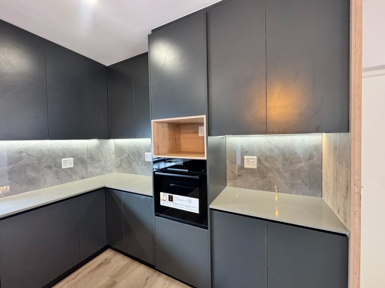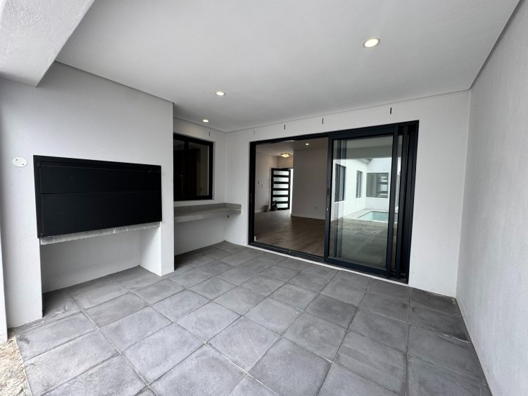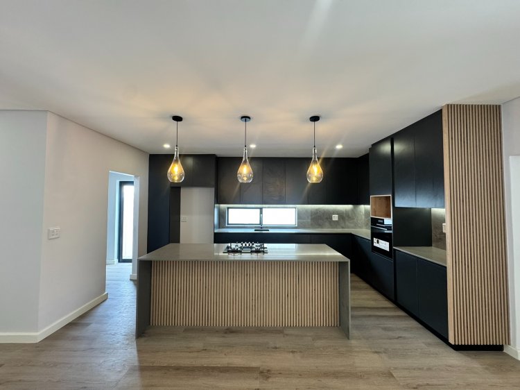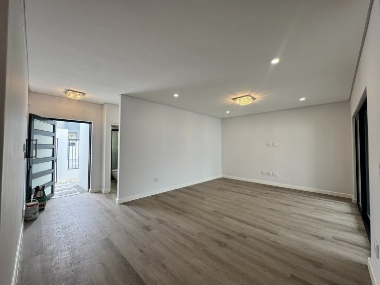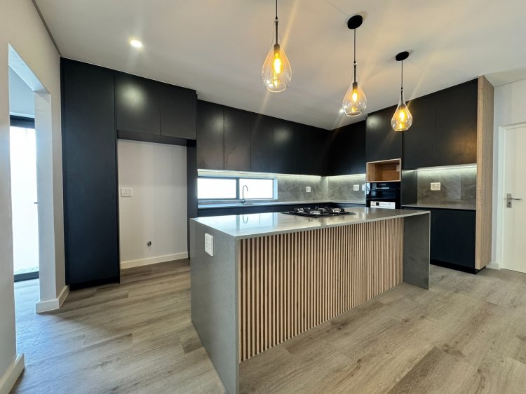The heart of the home is the open-plan living area, anchored by a sleek designer kitchen with an island, seamless cabinetry, and soft lighting that sets a modern yet welcoming tone. Tucked away is a scullery that can accommodate three appliances, ensuring both practicality and elegance. The space extends effortlessly into the dining and lounge areas, where large sliding doors invite natural light and lead out to the undercover braai-patio, perfect for entertaining while overlooking the splash pool.