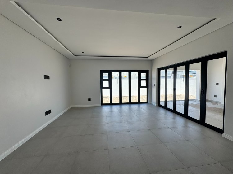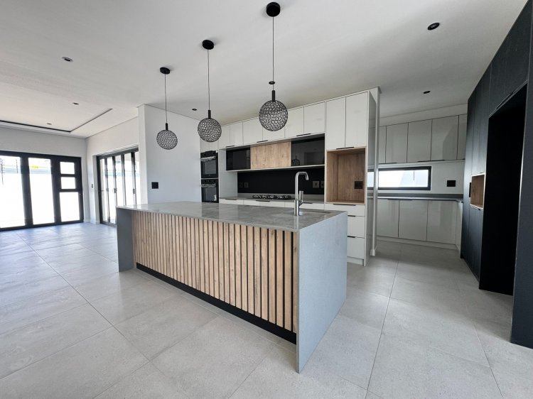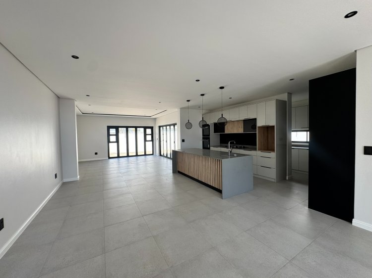 Downstairs, the home opens into a spacious, light-filled open-plan living area where the kitchen takes centre stage. Designed for both everyday living and entertaining, the kitchen features a gas hob, double eye-level ovens, sleek cabinetry, and a separate scullery that keeps the main space effortlessly uncluttered. The living and dining areas flow seamlessly toward the covered braai patio, creating an inviting indoor-outdoor lifestyle ideal for entertaining year-round.