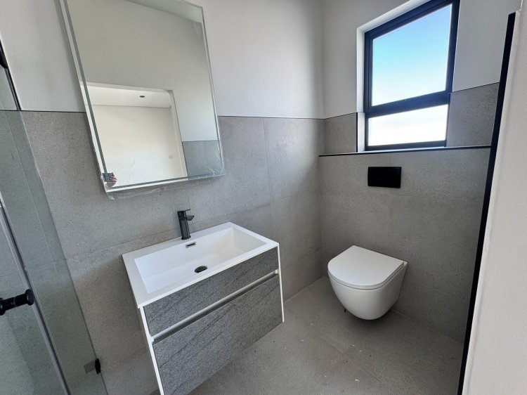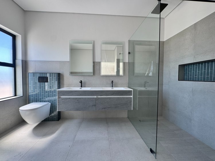 Upstairs, a well-planned layout includes linen cupboards, a study nook, and the remaining bedrooms, all with en-suite bathrooms. The main suite is truly the star of the home, offering generous cupboard space, a private balcony, and a luxurious en-suite bathroom complete with a double vanity, freestanding bath, and walk-in shower. Finished with a cohesive modern aesthetic and high-quality materials throughout, this home effortlessly combines style, comfort, and security, making it an exceptional choice for discerning buyers seeking contemporary family living.