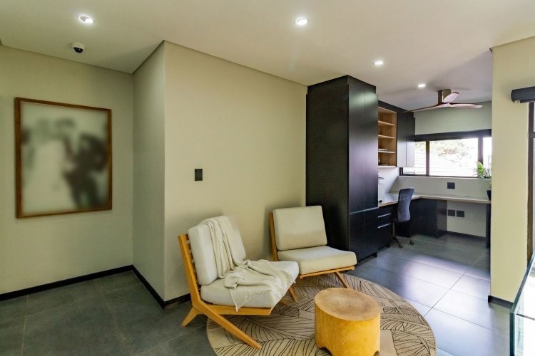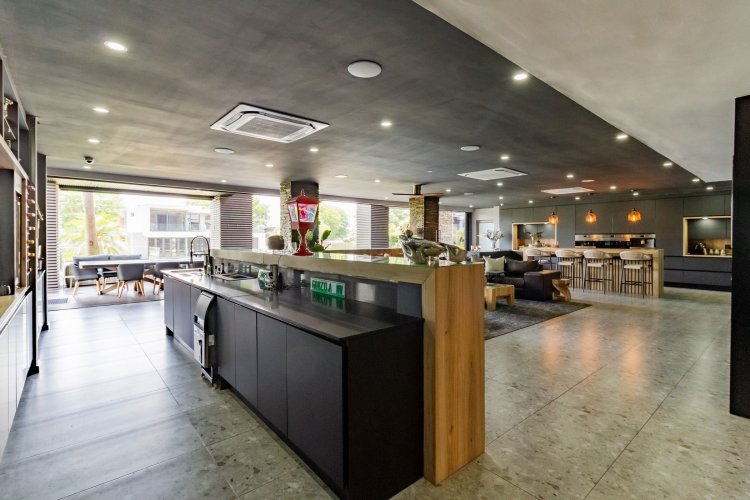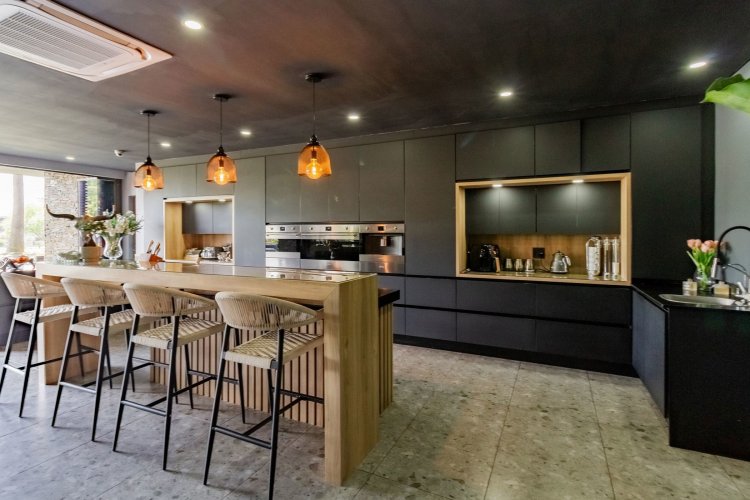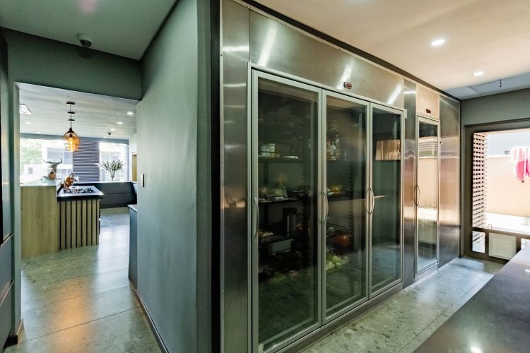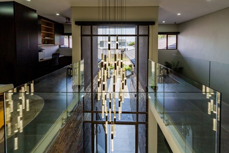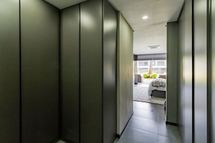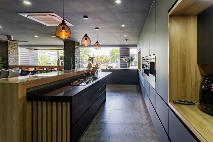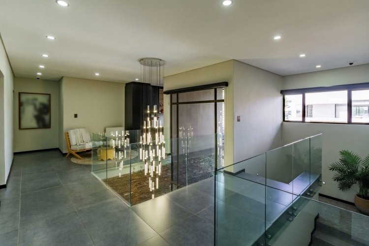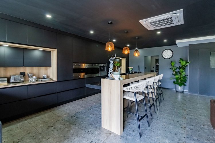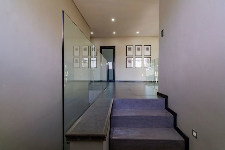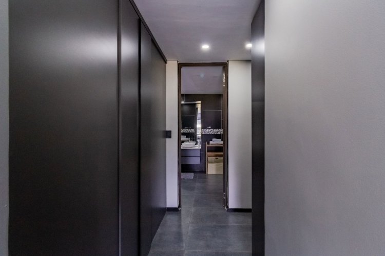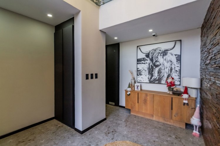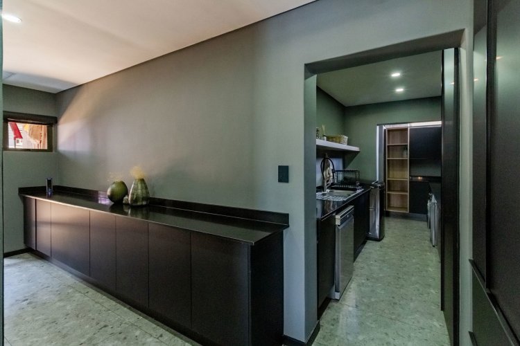 A glass pivot door opens into a double-volume entrance hall with built-in cupboards and a guest cloakroom. The corridor features sleek cabinetry that conceals components, guiding you past the staircase towards the main living areas. An open-plan arrangement connects the dining room, entertainment area with a generous centre island, and the living room. The contemporary kitchen includes a central island, gas stove, eye-level oven, built-in microwave, and coffee machine. A large scullery provides space for three appliances as well as walk-in cold-storage facilities.