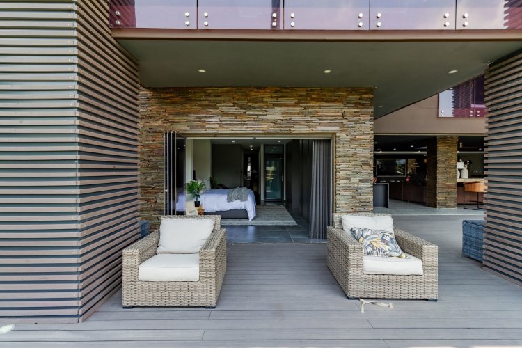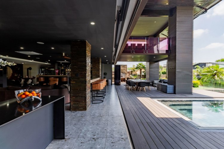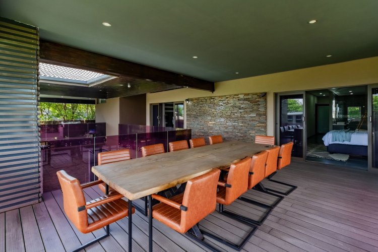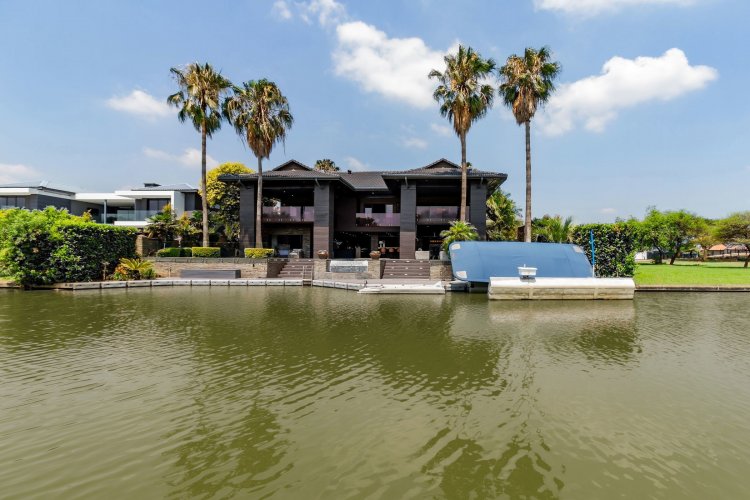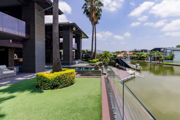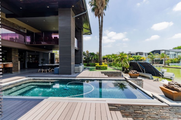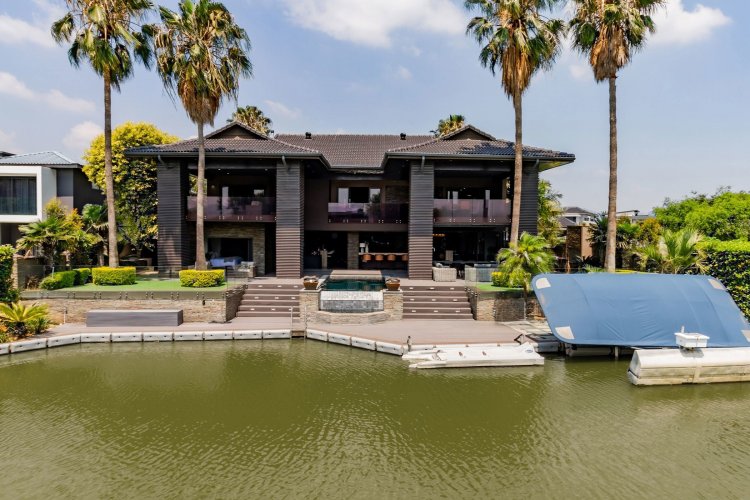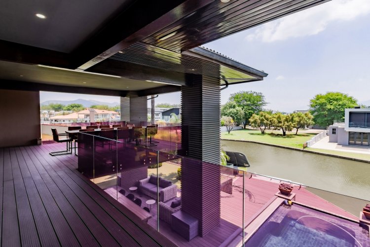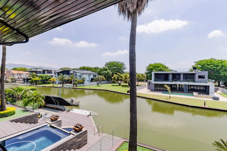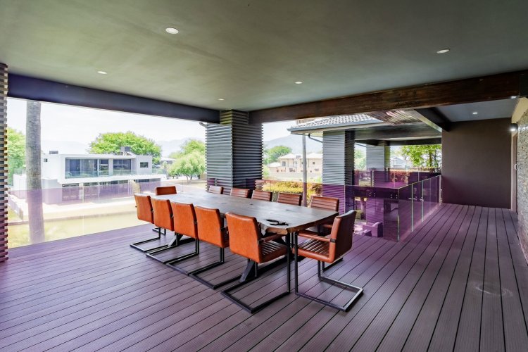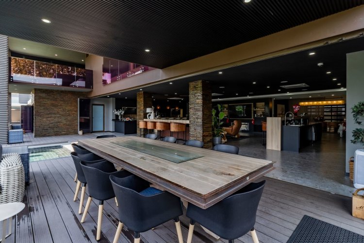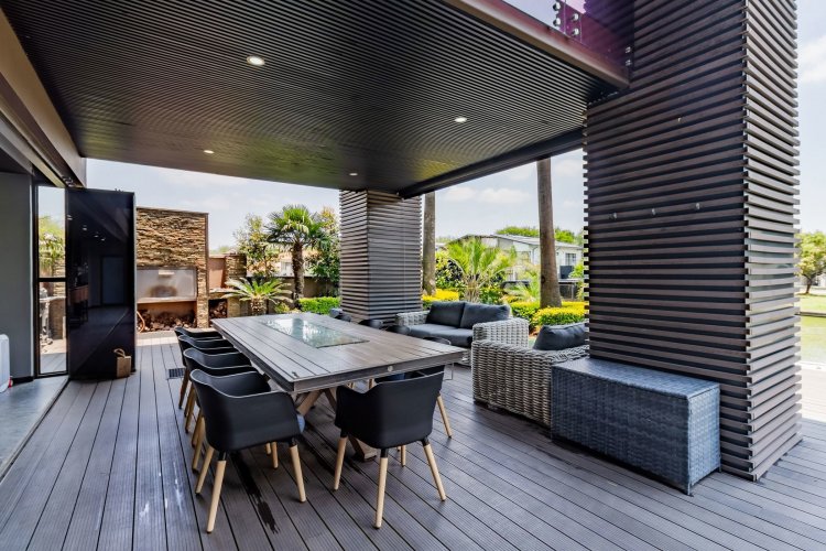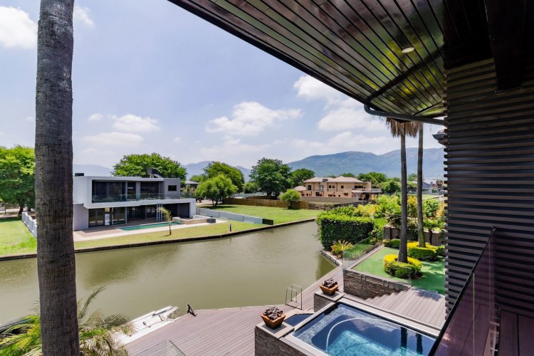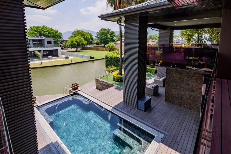 Glass stack doors stretch across the width of the home, allowing the interior to extend onto the outdoor spaces. The covered patio is ideal for evening drinks or family gatherings beside the heated pool, all set against views of the Magaliesberg Mountains. The composite deck offers mooring rights for effortless access to the canal.