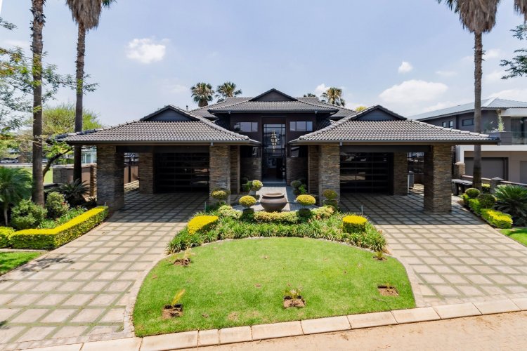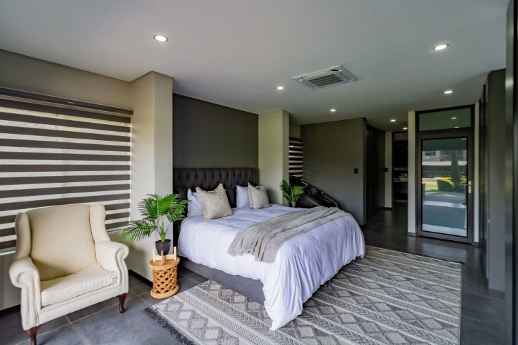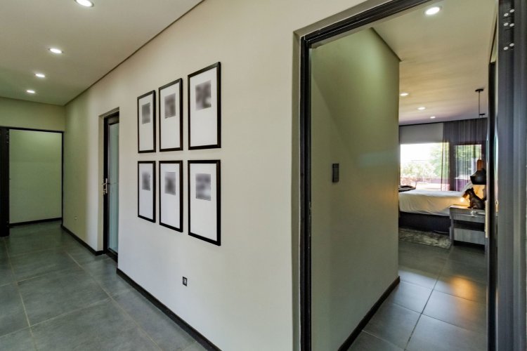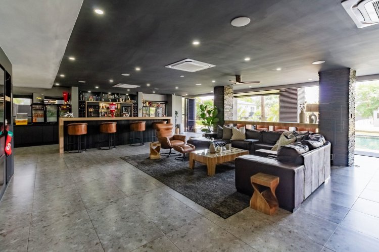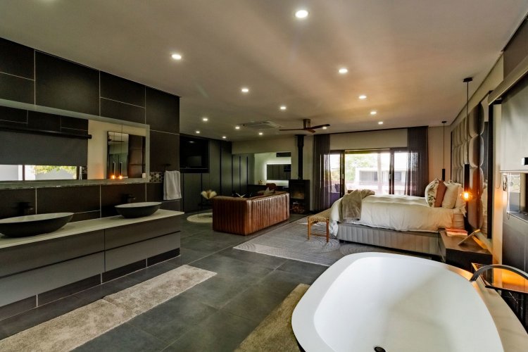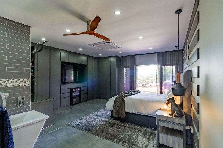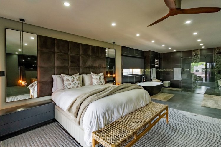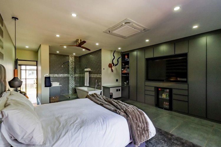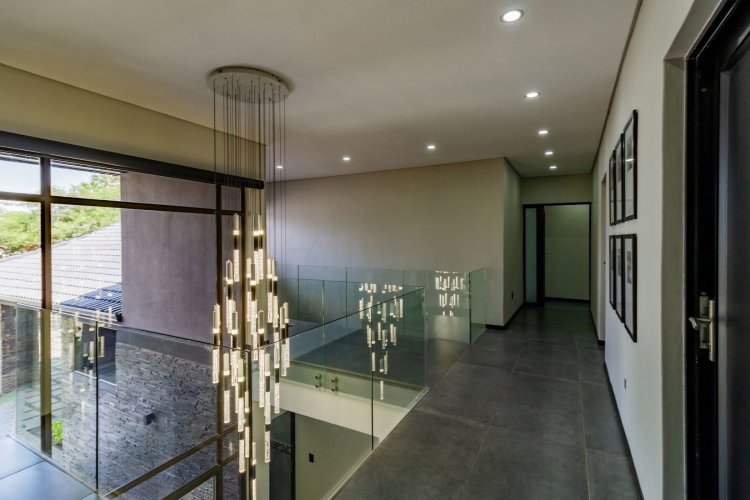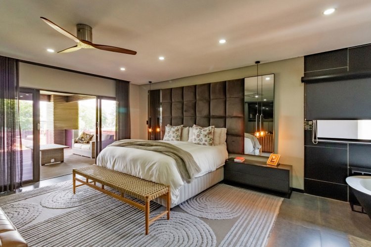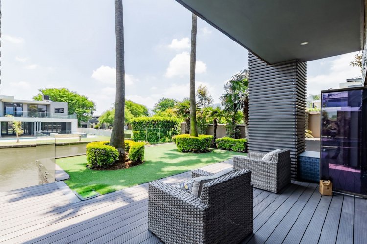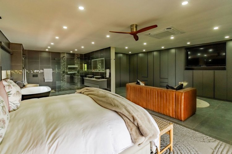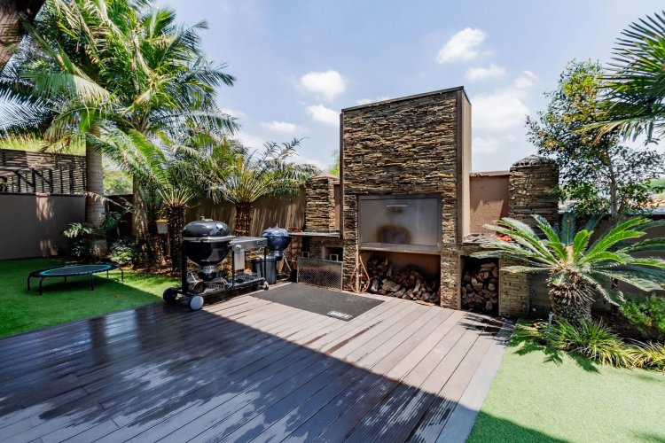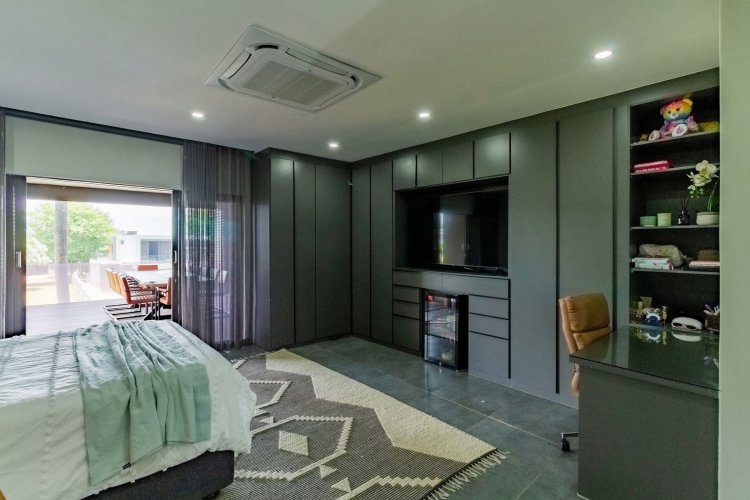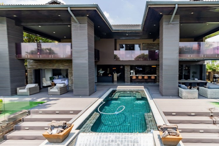 Glass stack doors stretch across the width of the home, allowing the interior to extend onto the outdoor spaces. The covered patio is ideal for evening drinks or family gatherings beside the heated pool, all set against views of the Magaliesberg Mountains. The composite deck offers mooring rights for effortless access to the canal.