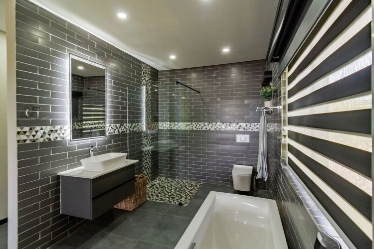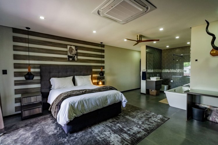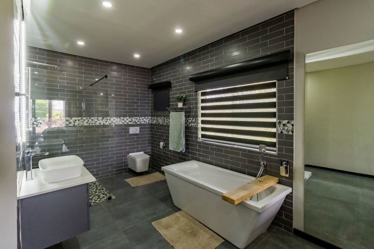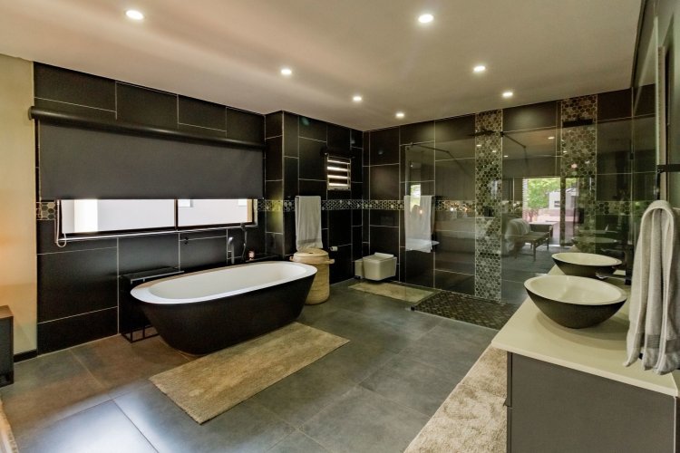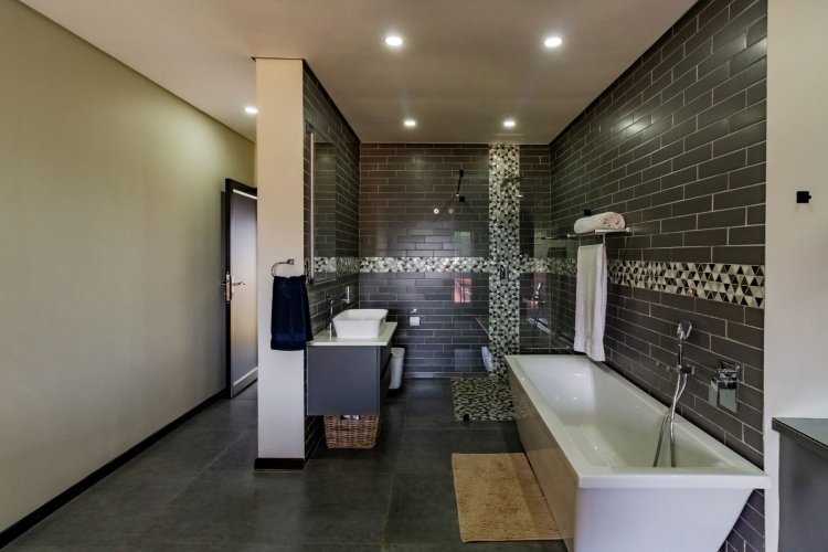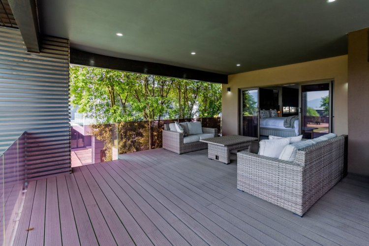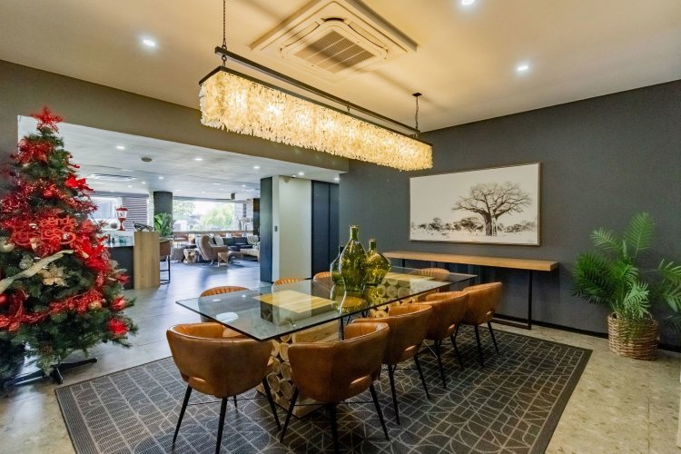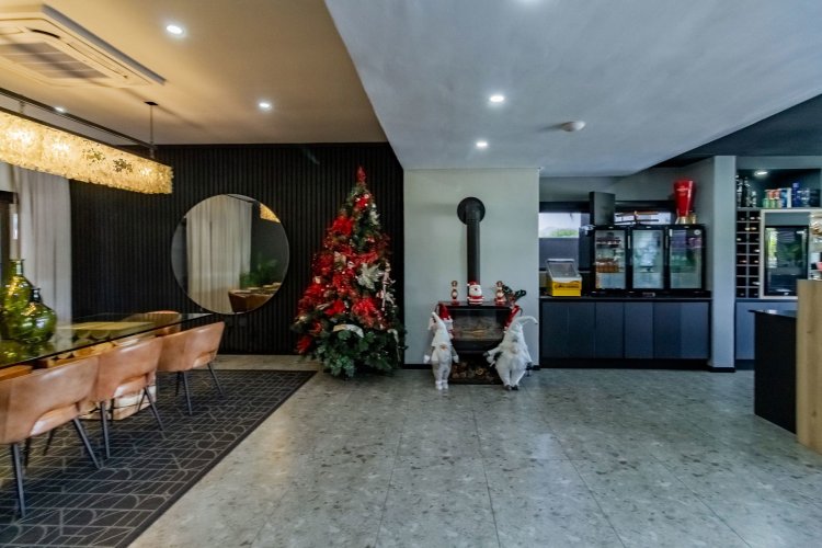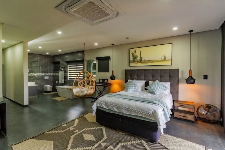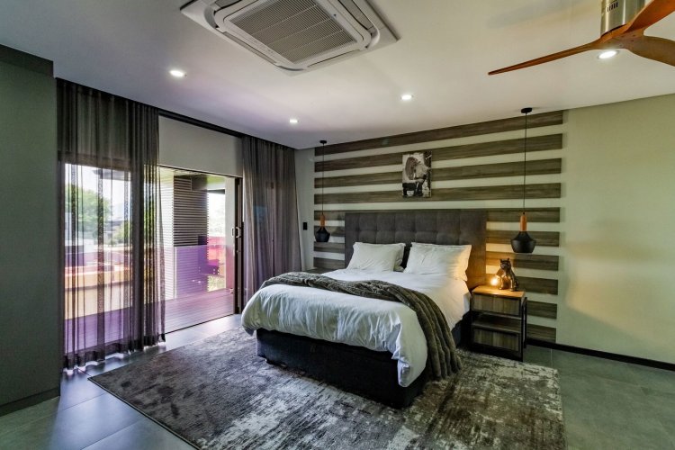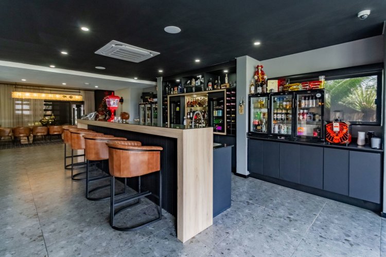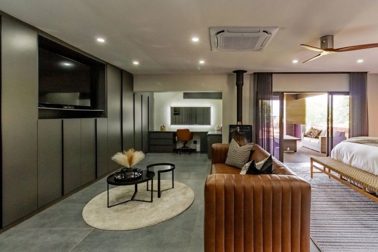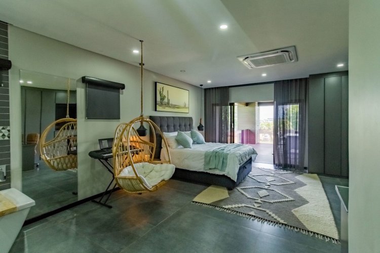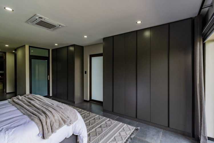 Glass stack doors stretch across the width of the home, allowing the interior to extend onto the outdoor spaces. The covered patio is ideal for evening drinks or family gatherings beside the heated pool, all set against views of the Magaliesberg Mountains. The composite deck offers mooring rights for effortless access to the canal.