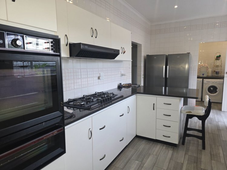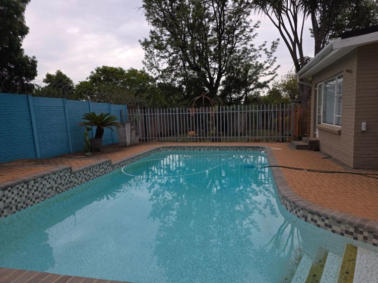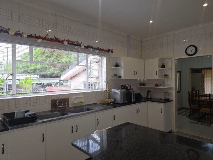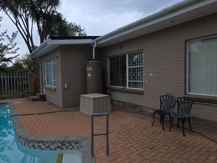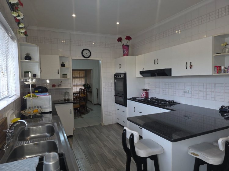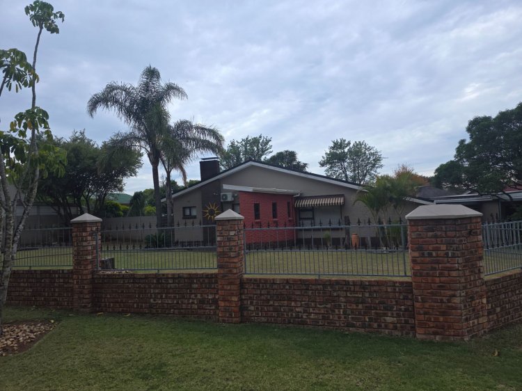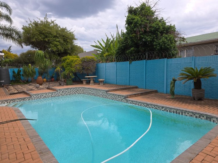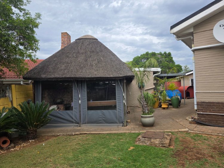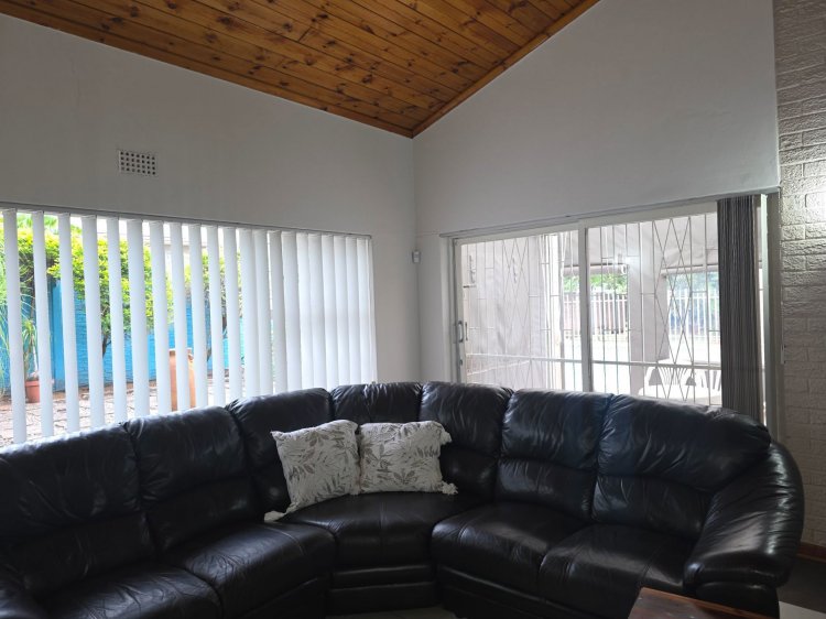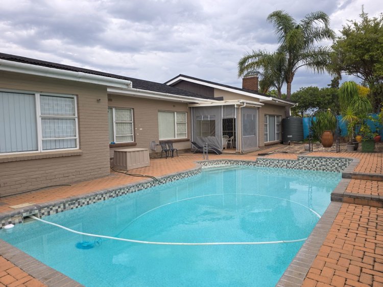 Set back from one of the prettiest streets in Vanes Estate, this exceptional home boasts a fabulous entertainment area and all the space in the world. The property is protected by an attractive wall with wrought iron insets and accessed via a remote front gate that leads to a paved forecourt. In addition to an automated double garage, a triple carport ensures that there's safe parking for three more vehicles. And then there's the showstopper entrance hall. Illuminated by transparent roofing, its unusual, curved architecture evokes an art gallery vibe and sets a welcoming tone for the interior. Graced by soaring wooden ceilings, the living rooms include a lounge with a stone-clad fireplace, built-in wood storage, aircon and sliding doors to a large, sparkling blue swimming pool. Warm in winter and cool in summer, the lounge flows easily into the TV room, also with access to the pool and air-conditioning, the dining room for casual and formal meals, and out to a covered stoep with pull-down weather blinds. Surrounded by brick paving, the sun-splashed pool is offset by low maintenance plantings and a vibrant wall to ensure privacy from the neighbours. For the family chef, the stylish white kitchen with its contrasting dark granite tops, is a visual and practical feast! It's equipped with a gas hob, extractor fan, double eye-level oven, and a counter with seating space for companiable cooking and breakfasts on the go. Alongside is a scullery with machine connections and a deep double sink for heavy duty washing. Last but not least there is a thatched lapa with a built-in braai and pulldown blinds, so whether it's raining, windy or cold, you'll never have to postpone the party. For mom and dad, the main bedroom is pure indulgence with laminated floors, aircon and a door to the pool, as well las a walk-in closet, walk-in dressing room, and a relaxing bathroom with a tub and storage-savvy vanity. Three more comfortable bedrooms and a full family bathroom accommodate everyone else. Other impressive features are ceiling light / fan combos and window blinds throughout, water tanks, solar geyser, burglar bars, alarm, and security gates on exterior doors. If you're looking for a forever-summer home for your family, with good schools on its doorstep, please contact us today to set up an appointment to view this sensational property.