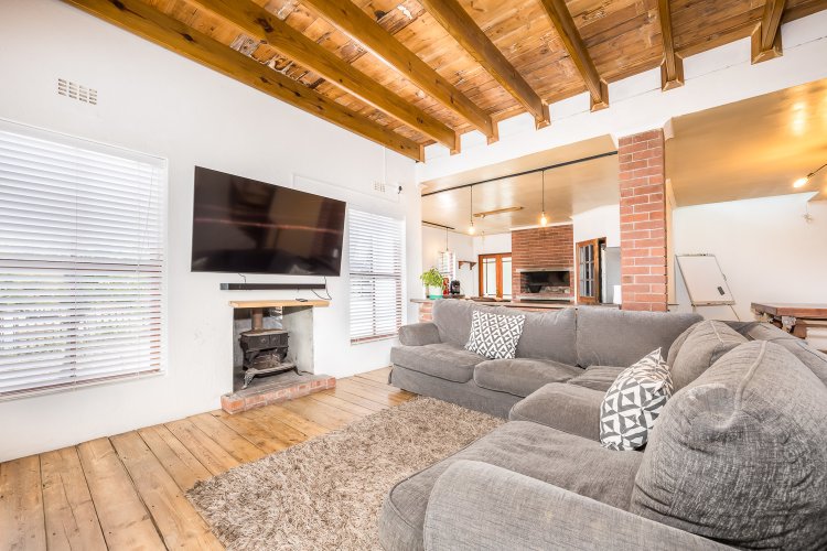 Upon entering the front door, a handsomely sized living area with fireplace and genuine wooden floors invites you in, leading to open plan farm- style kitchen with fireplace