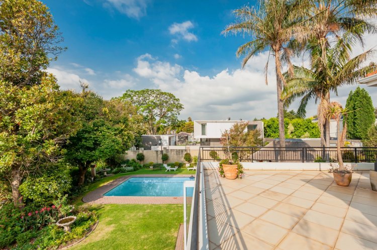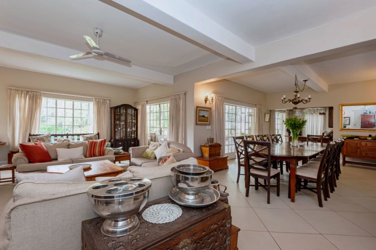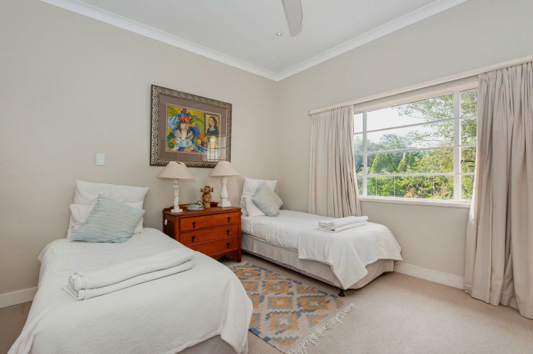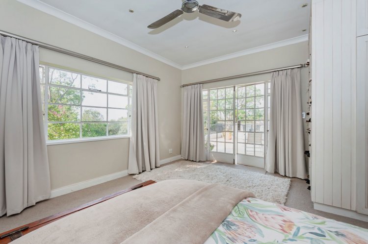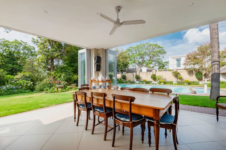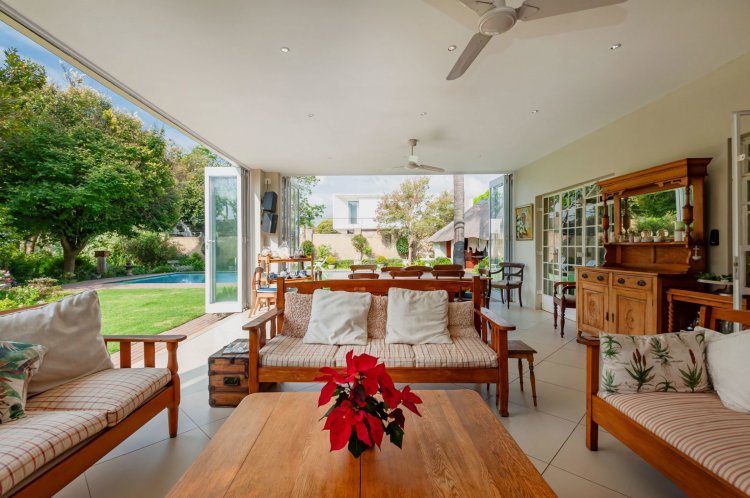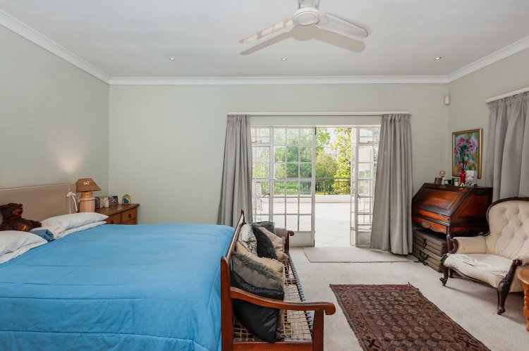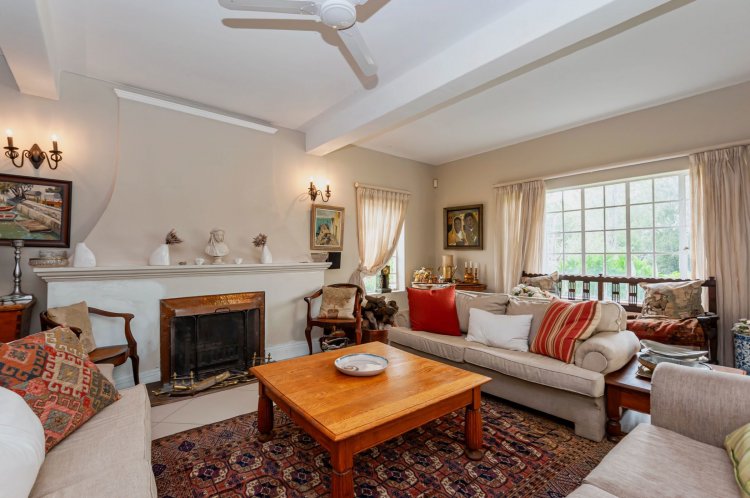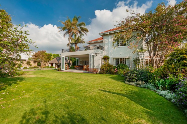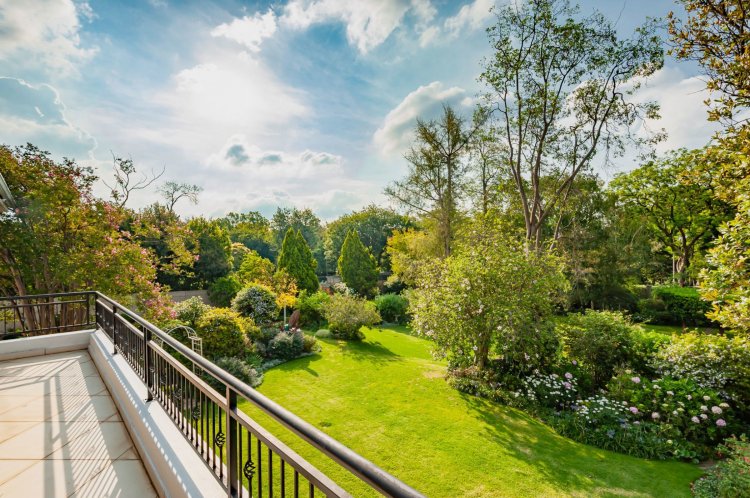 Upstairs, the home boasts five bedrooms, three en-suite bathrooms, and a generous pyjama lounge with a fireplace. Two bedrooms open onto a balcony overlooking the magnificent garden.
