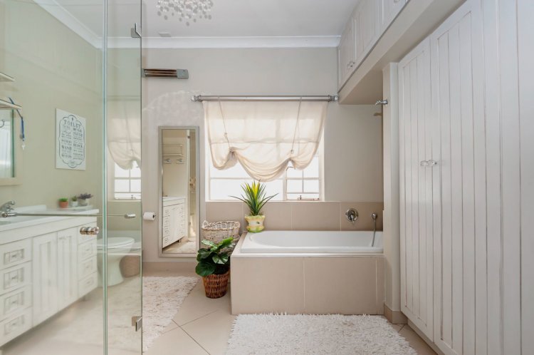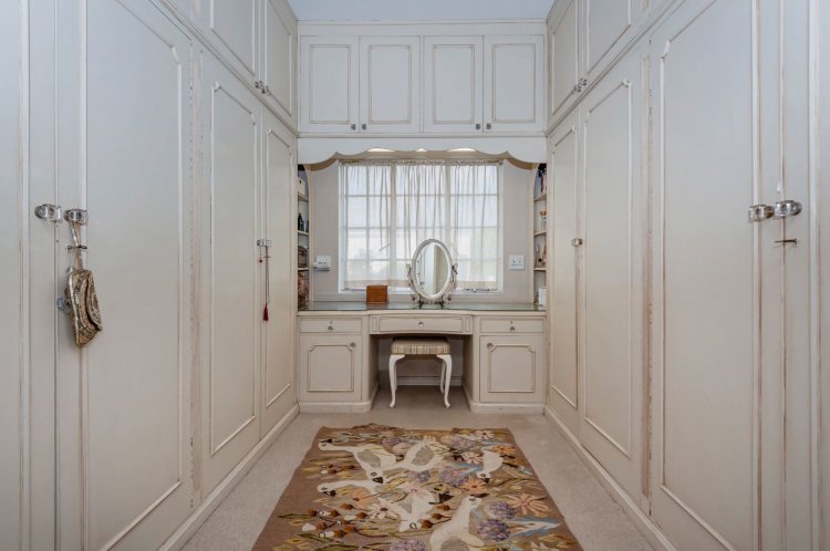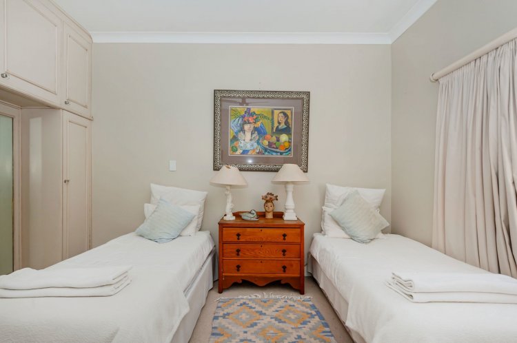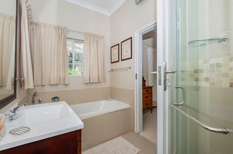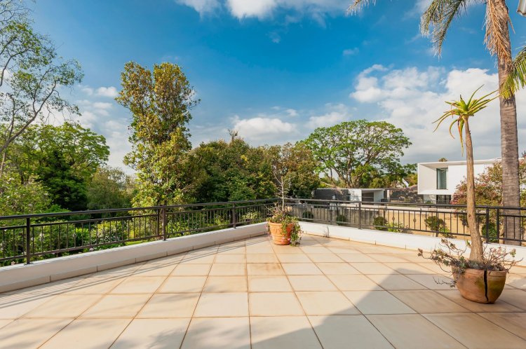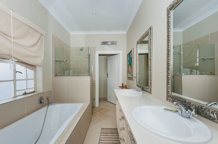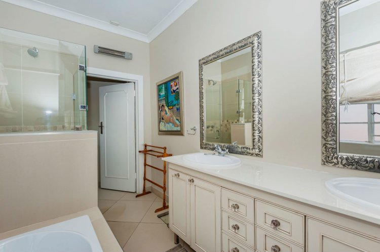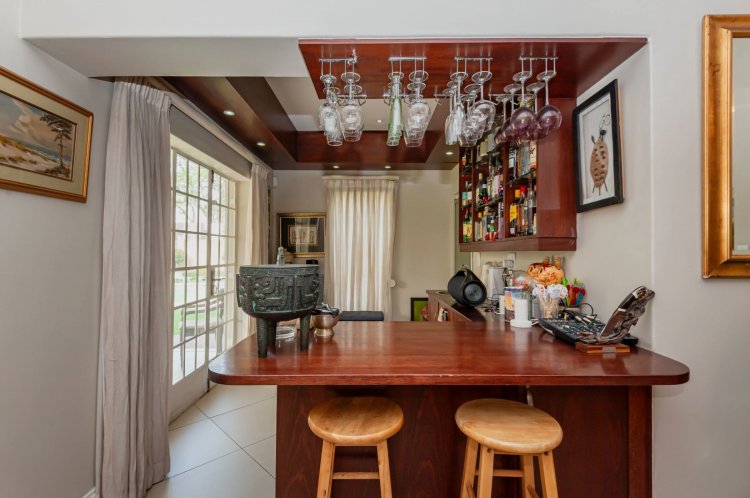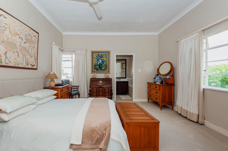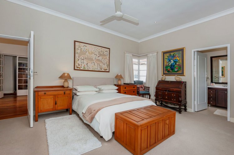 Upstairs, the home boasts five bedrooms, three en-suite bathrooms, and a generous pyjama lounge with a fireplace. Two bedrooms open onto a balcony overlooking the magnificent garden.