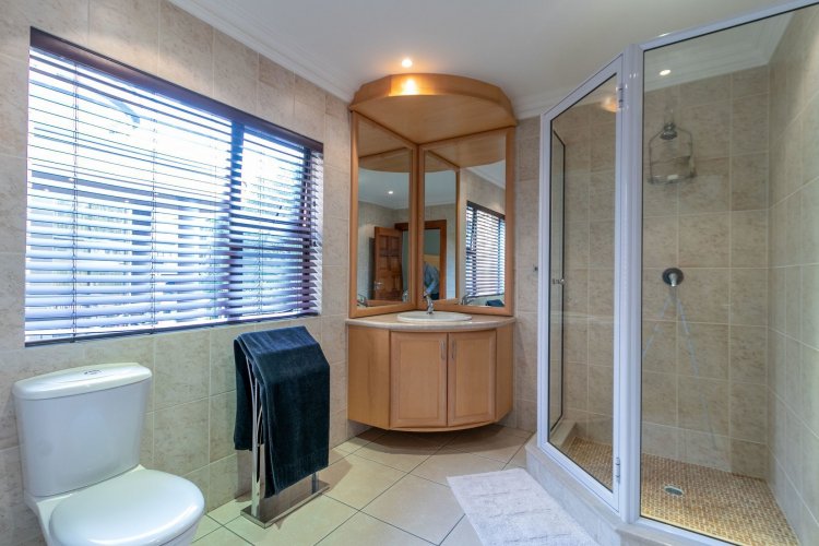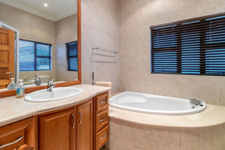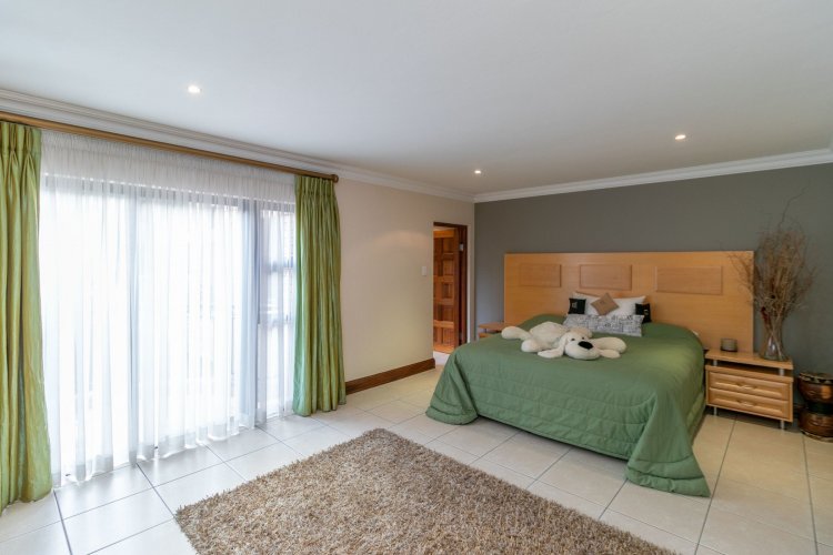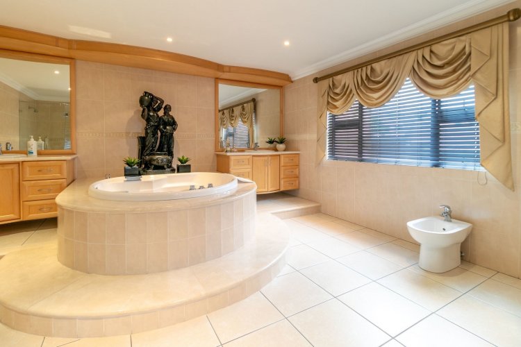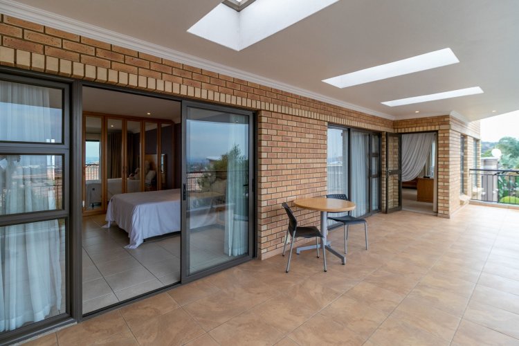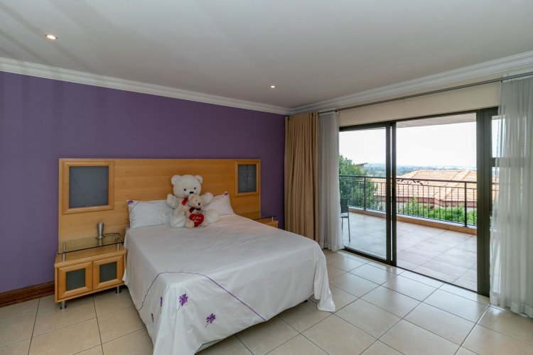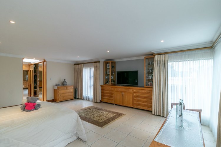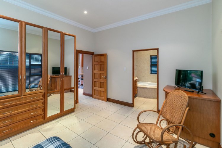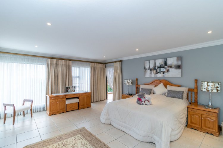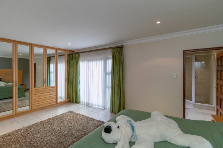 The upper level includes five bedrooms and three bathrooms, two of which are en-suite. All cupboards are custom-made beechwood and built-in. The spacious main bedroom's walk-in cupboard areas on either side of the passage lead to a jacuzzi en-suite, ideal for a couple. The upstairs pyjama lounge features custom-made beechwood built-in television wall units and ample space. All five upstairs bedrooms and the pyjama lounge open onto balconies with majestic views.