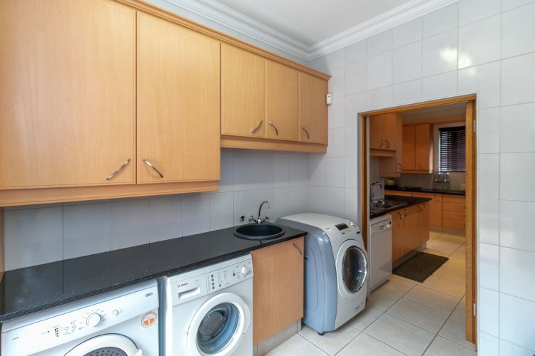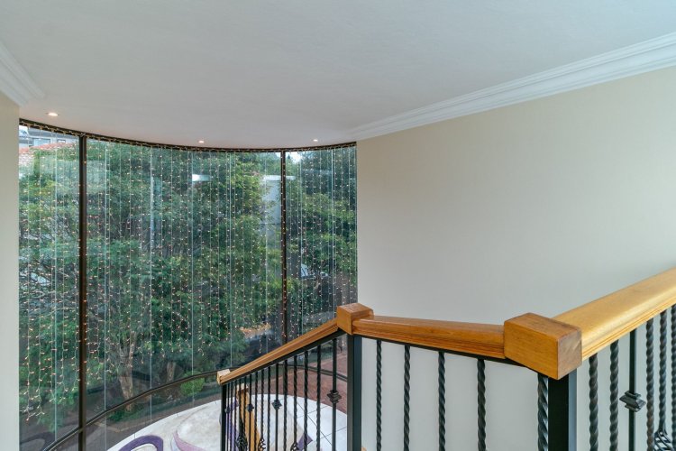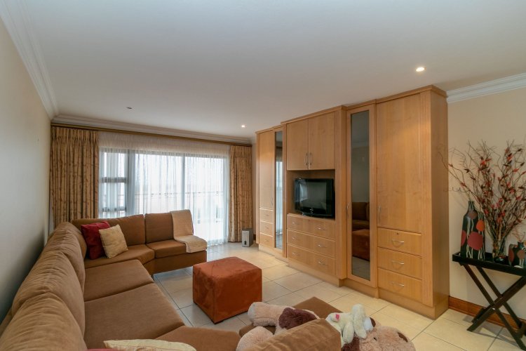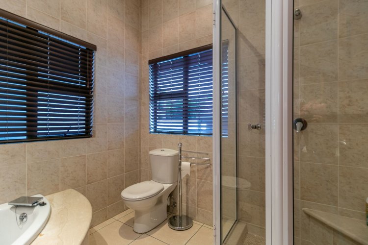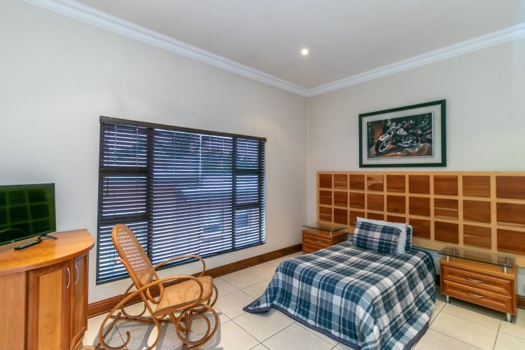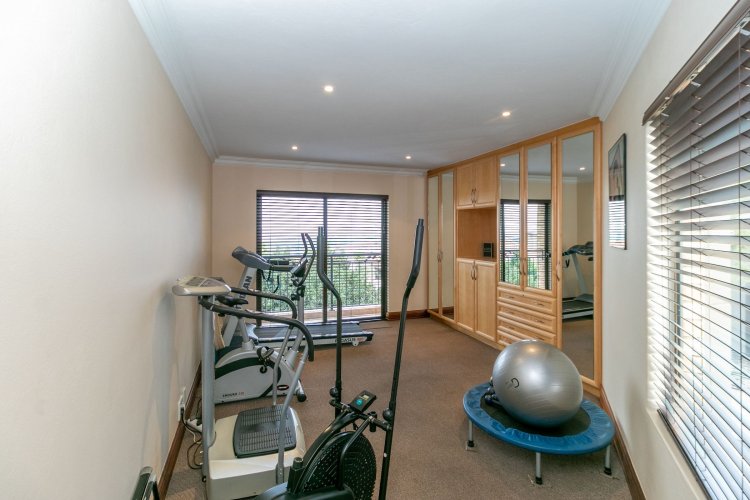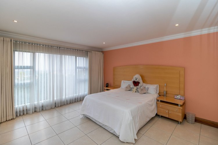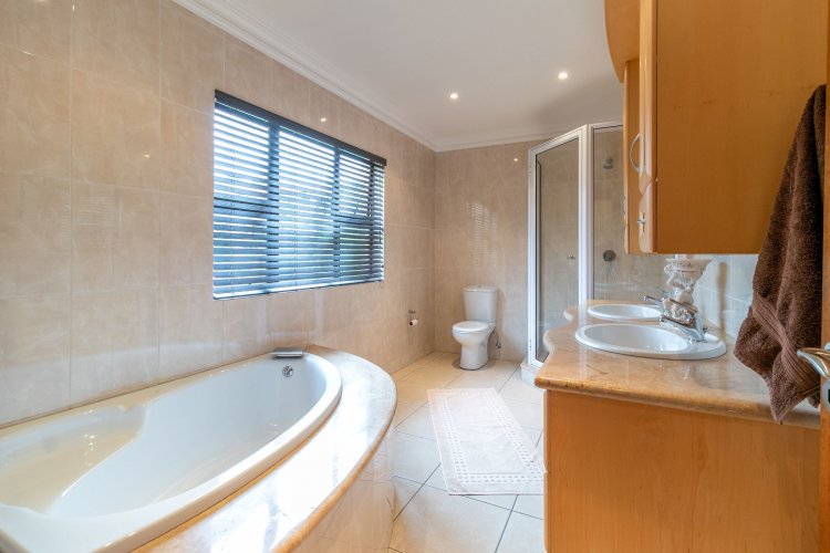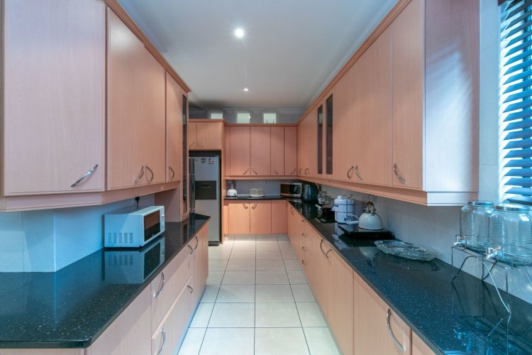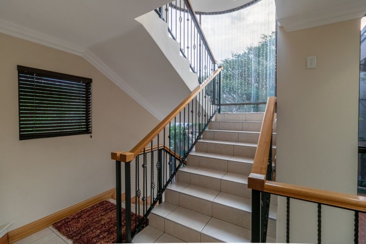 The upper level includes five bedrooms and three bathrooms, two of which are en-suite. All cupboards are custom-made beechwood and built-in. The spacious main bedroom's walk-in cupboard areas on either side of the passage lead to a jacuzzi en-suite, ideal for a couple. The upstairs pyjama lounge features custom-made beechwood built-in television wall units and ample space. All five upstairs bedrooms and the pyjama lounge open onto balconies with majestic views.