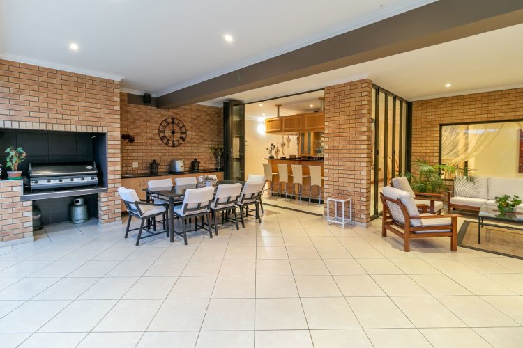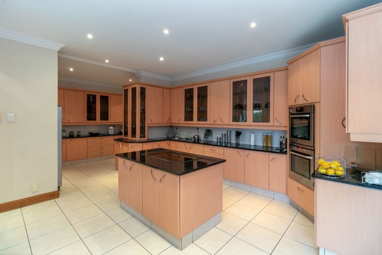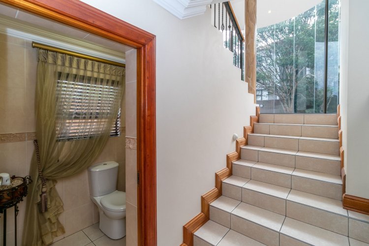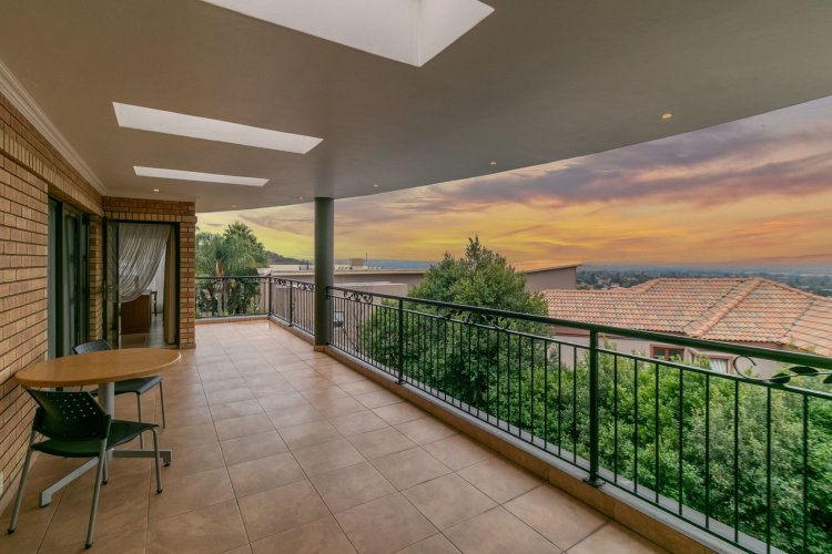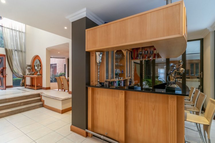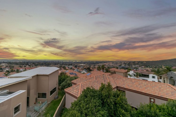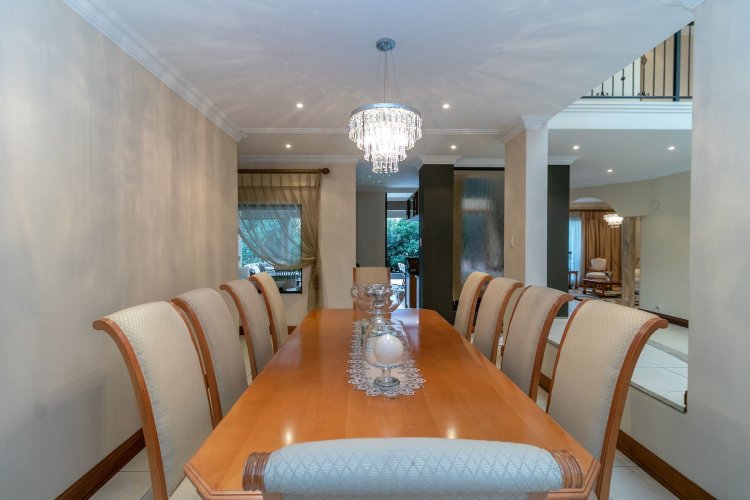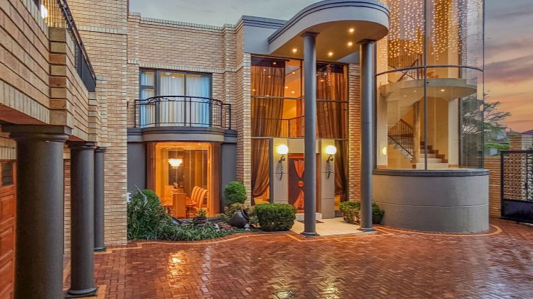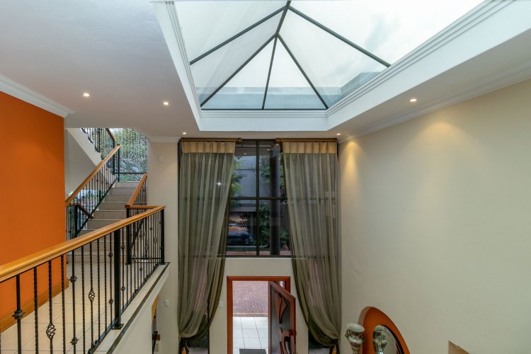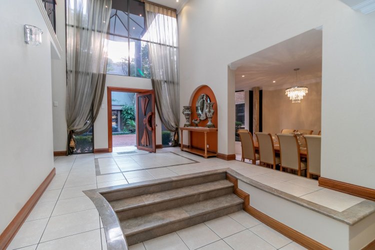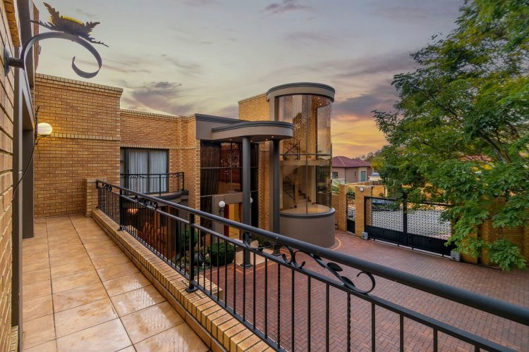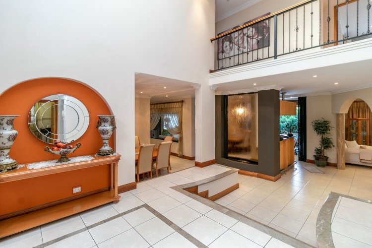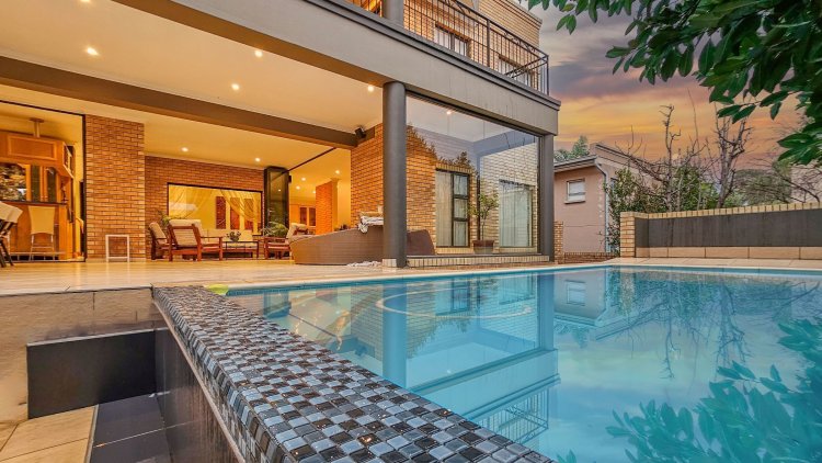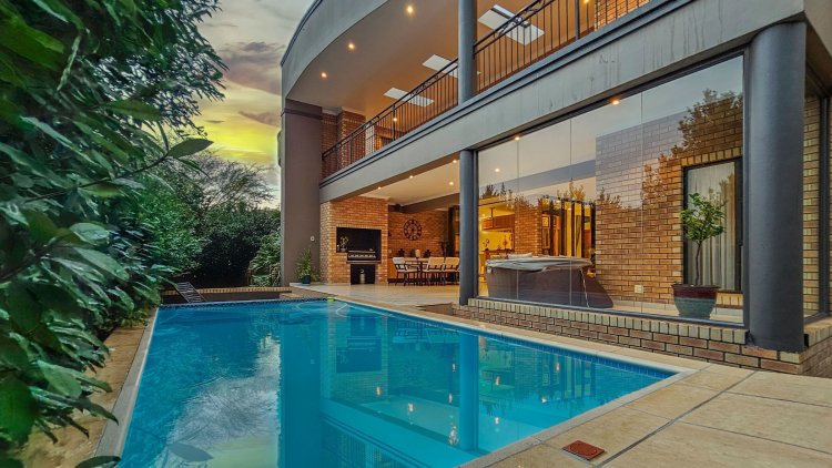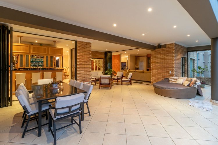 Upon entering this architectural masterpiece, you are greeted by a skylighted, voluminous entrance and staircase leading to the upper and roof levels, with a view of an elegant mirrored flowing water feature. The majestic entrance hall flows into a stacked door bar, indoor braai, luxuriously seated entertainment area, and heated pool. The formal chandelier lounge, TV lounge, and chandelier dining room exude pure class. The fully fitted kitchen features two AEG ovens, a Miele hob, a center island, a breakfast nook, a scullery, and a laundry area. The home office is equipped with built-in beechwood cabinets and leads into a boardroom, suitable for an executive's meetings with clients or staff. Up to six cars can be housed in three garages, one side tandem.