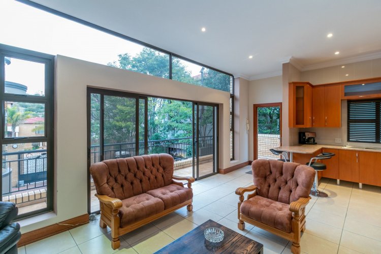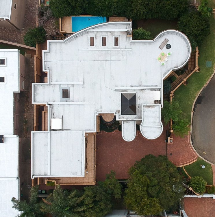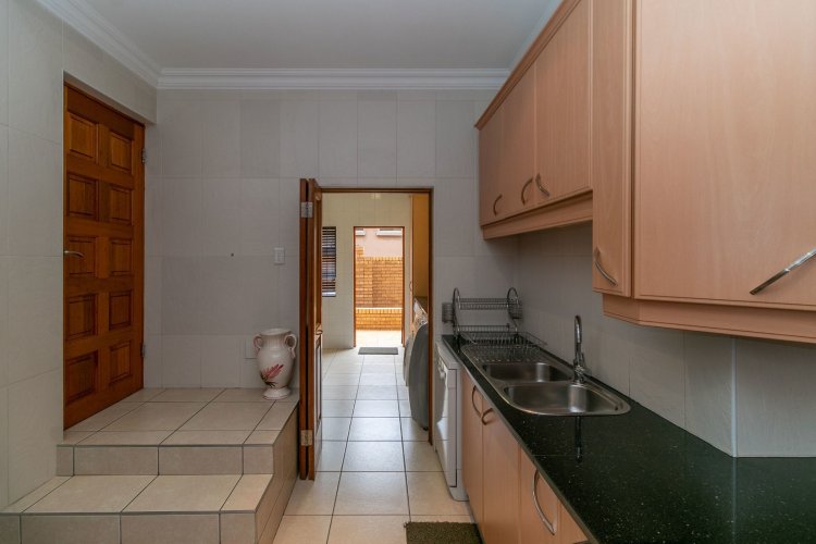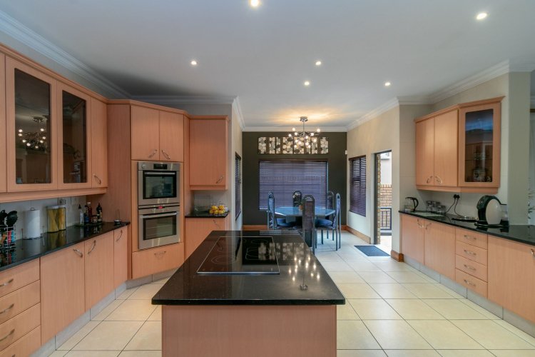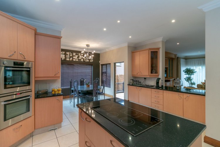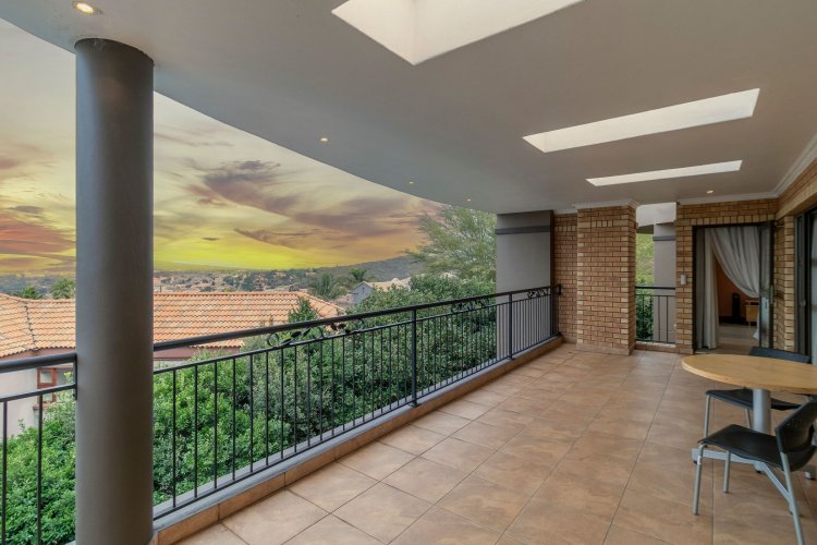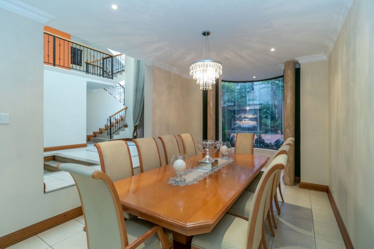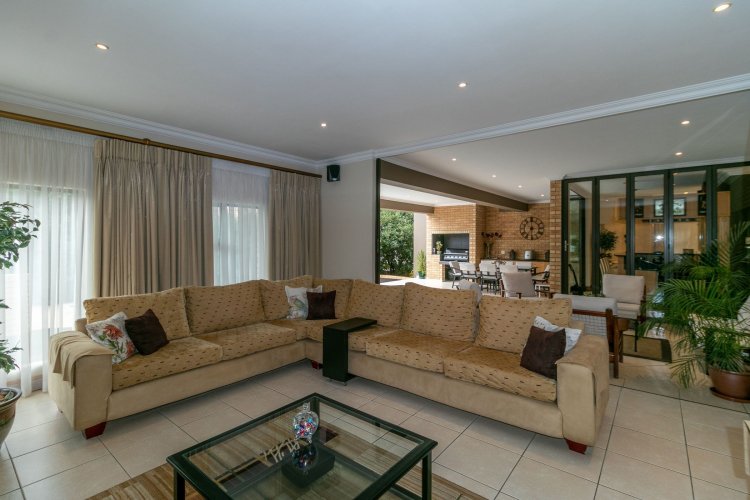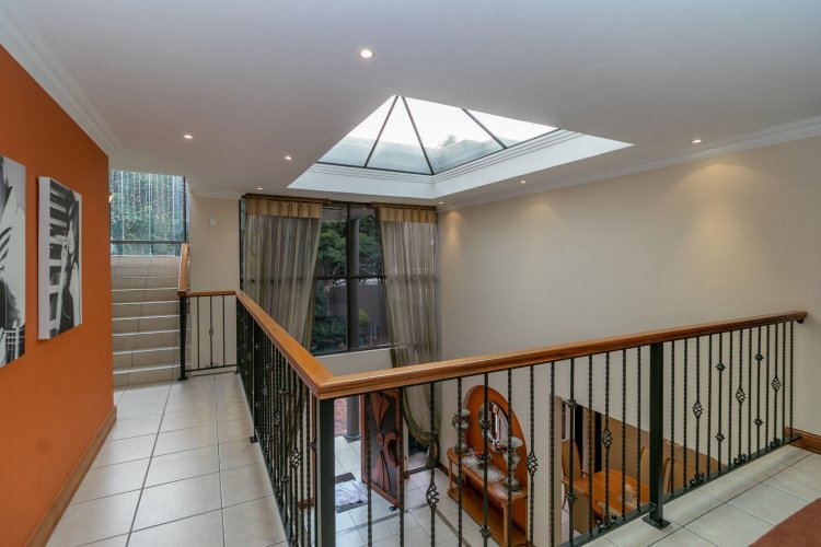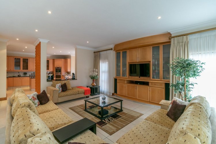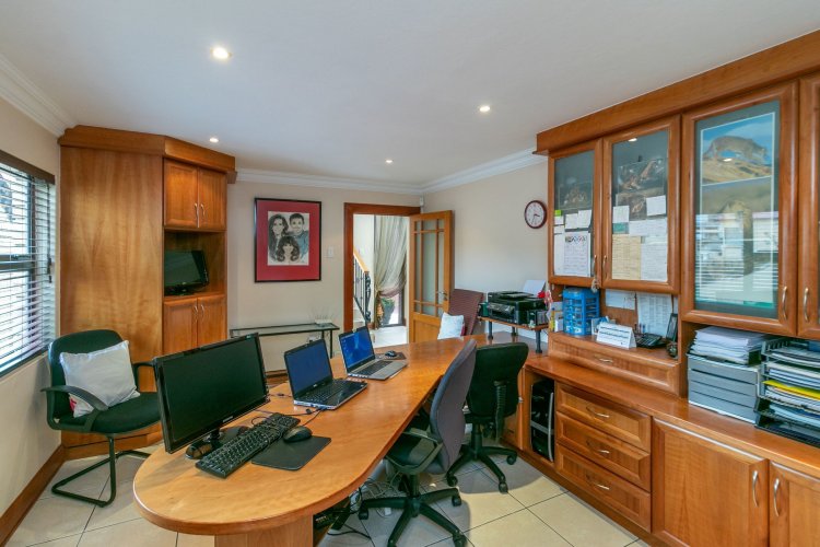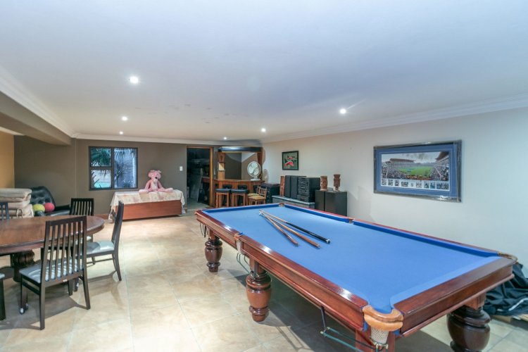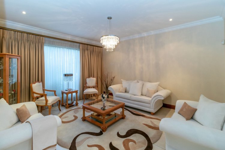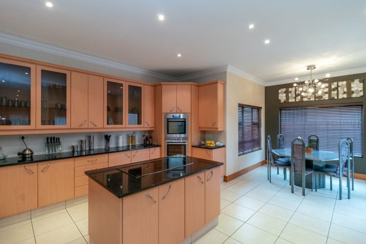 Upon entering this architectural masterpiece, you are greeted by a skylighted, voluminous entrance and staircase leading to the upper and roof levels, with a view of an elegant mirrored flowing water feature. The majestic entrance hall flows into a stacked door bar, indoor braai, luxuriously seated entertainment area, and heated pool. The formal chandelier lounge, TV lounge, and chandelier dining room exude pure class. The fully fitted kitchen features two AEG ovens, a Miele hob, a center island, a breakfast nook, a scullery, and a laundry area. The home office is equipped with built-in beechwood cabinets and leads into a boardroom, suitable for an executive's meetings with clients or staff. Up to six cars can be housed in three garages, one side tandem.